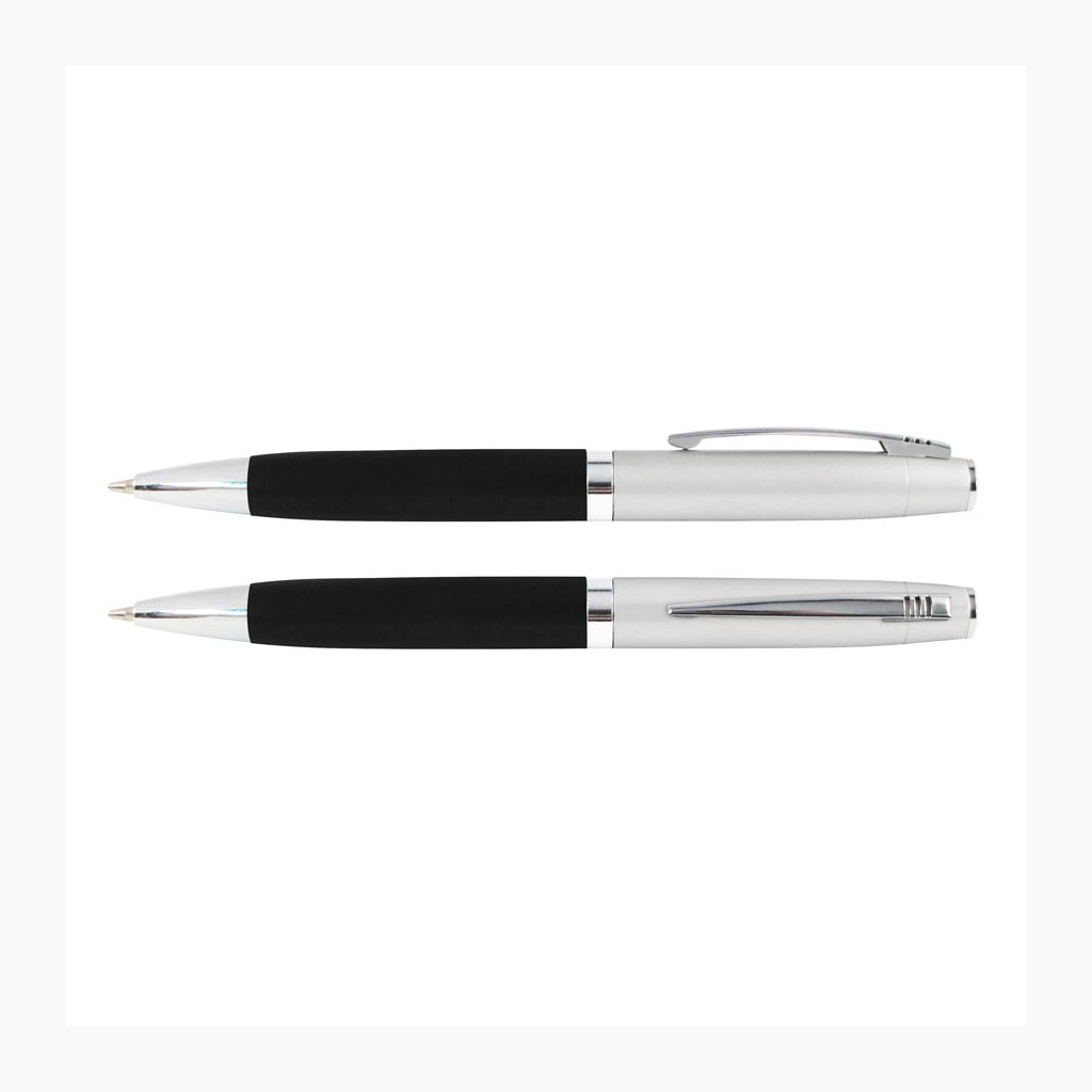 Bolígrafo Metálico bicolor modelo «Chairman». Cuerpo inferior superficie engomada negra, cuerpo superior plata satinado, terminales cromados. Escritura negra.