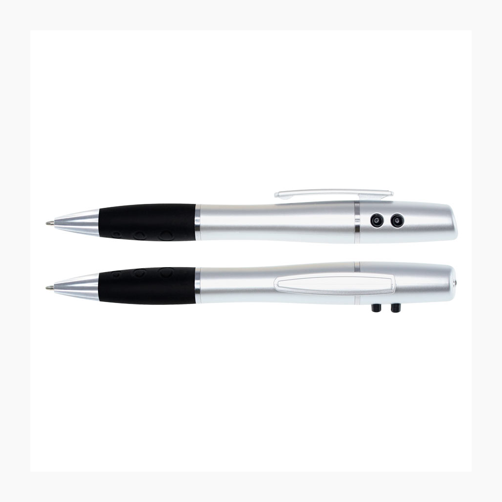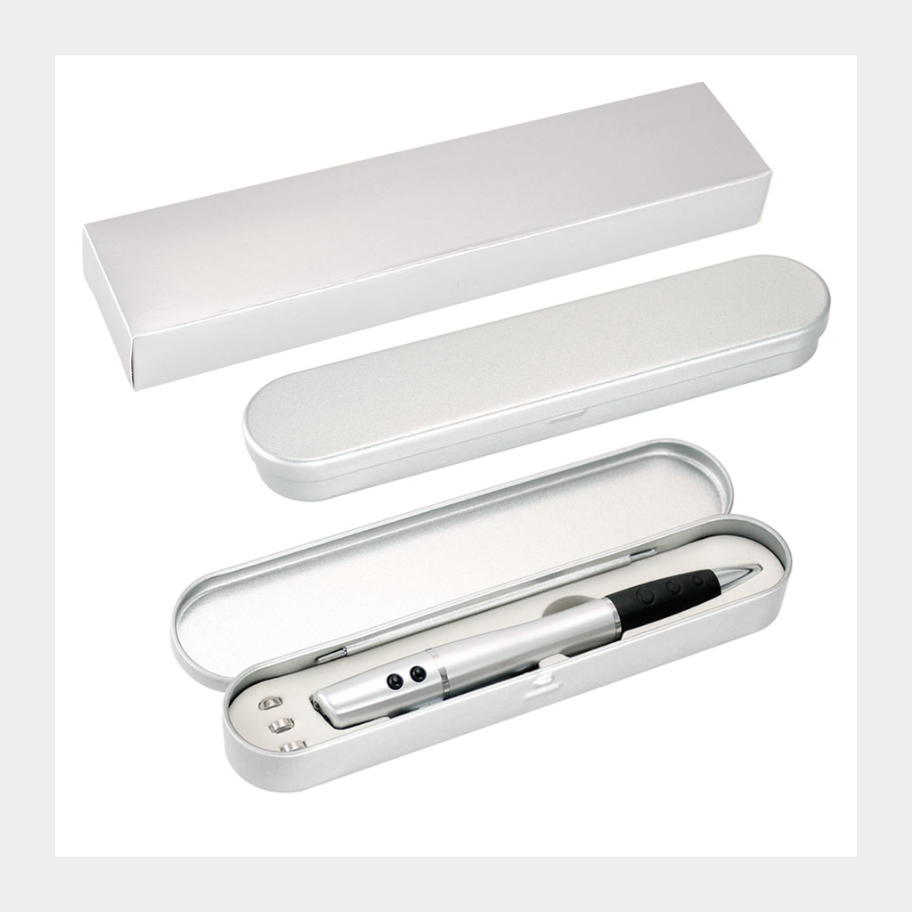 Bolígrafo plástico multi-función 3 en 1. Incluye bolígrafo, linterna LED y puntero láser. Escritura negra. Presentación en estuche metálico y caja plateada de cartón.