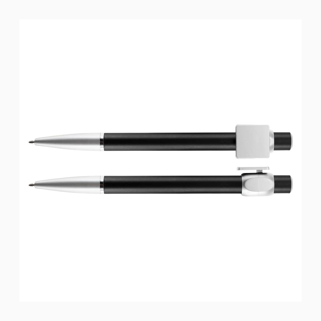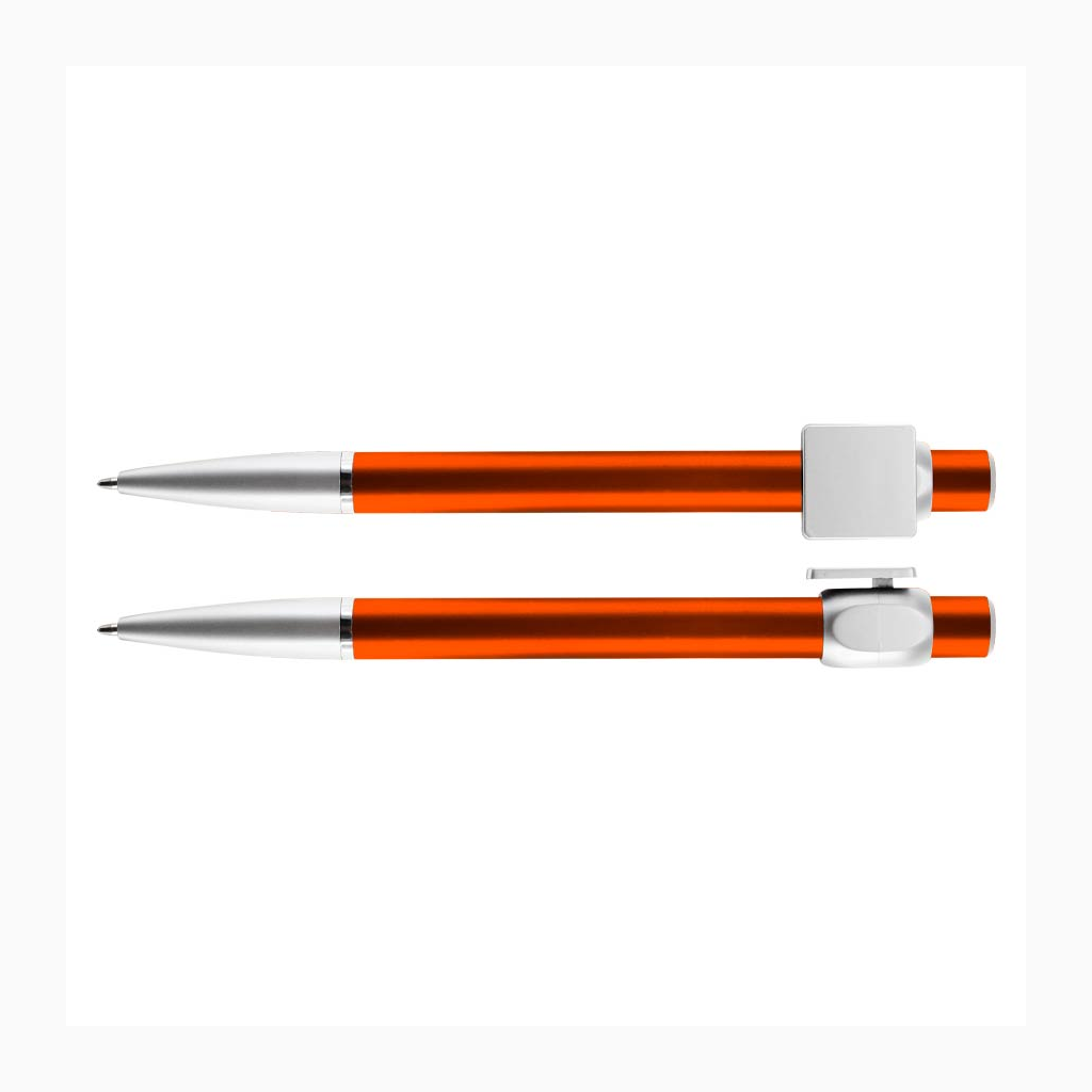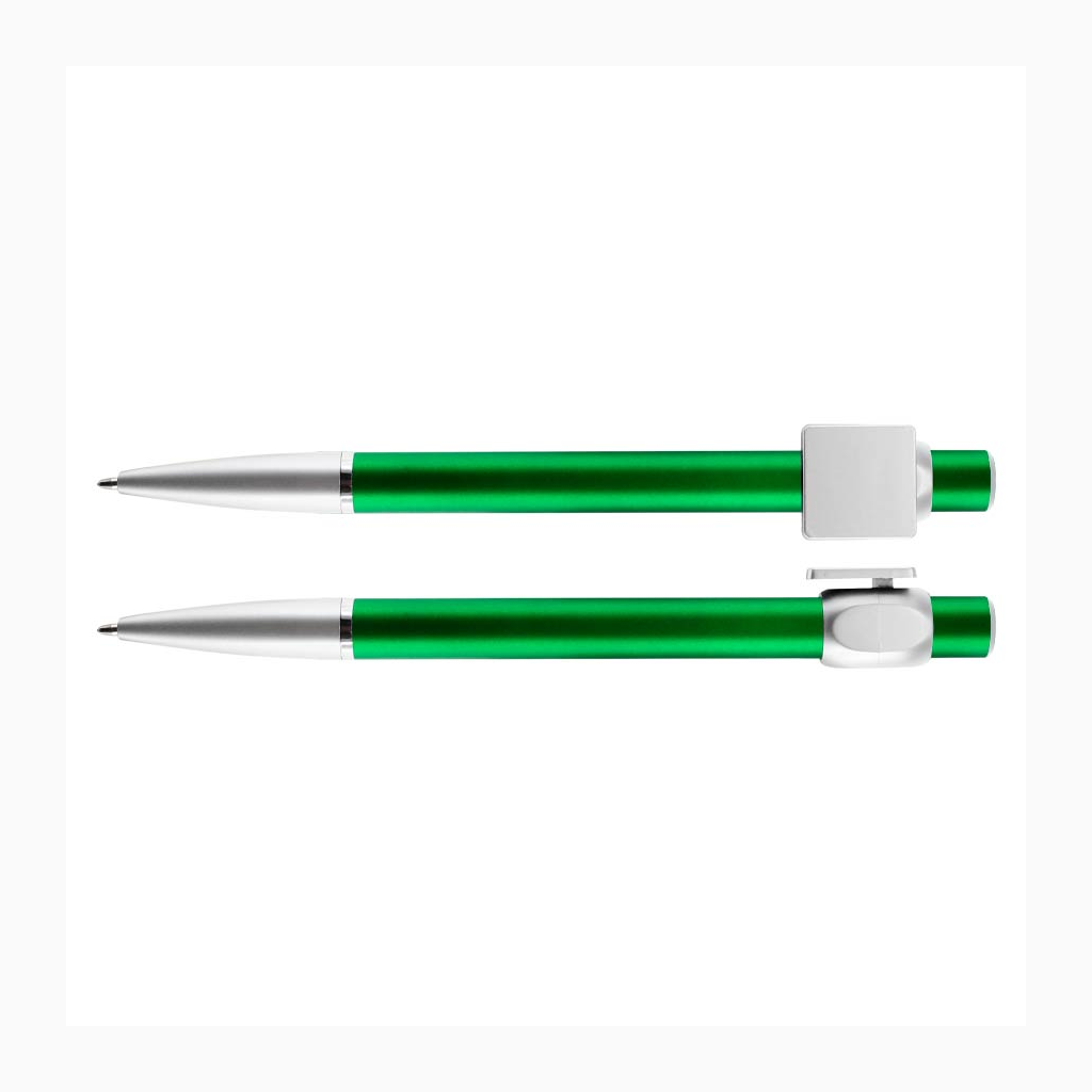 Bolígrafo «Badge» con cuerpo de color metalizado y clip cuadrado plateado, ideal para imprimir isotipos. Escritura azul.
