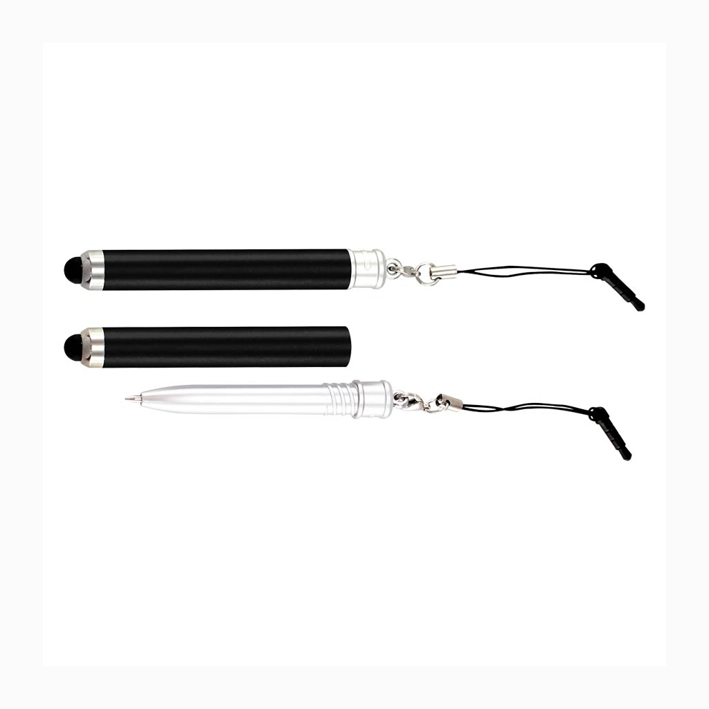 Bolígrafo «Touch-Screen» con cuerpo plateado, tapa de color metalizado y goma posterior negra para pantalla táctil. Incluye práctico soporte plástico para insertar en la salida de auricular del iPhone. Escritura azul.