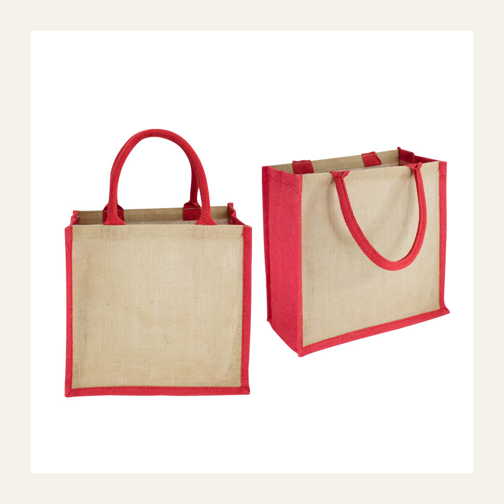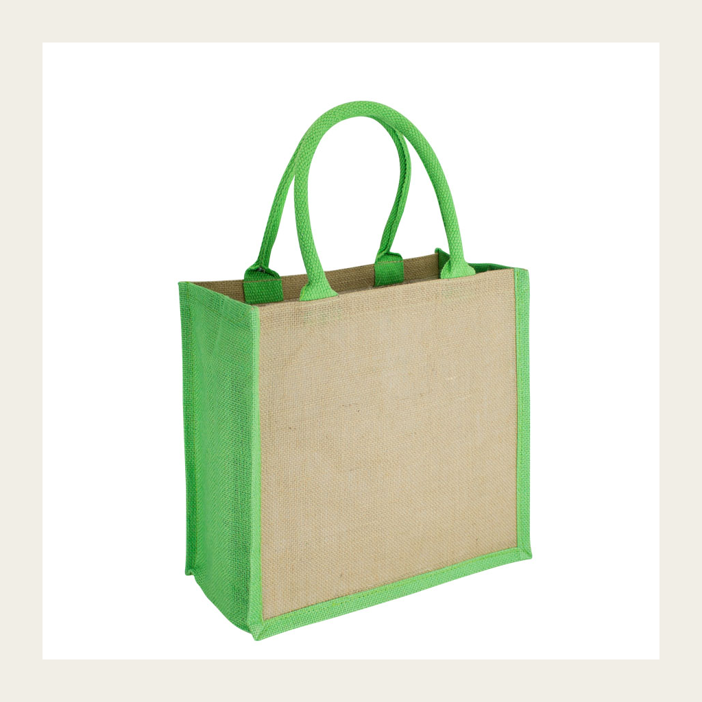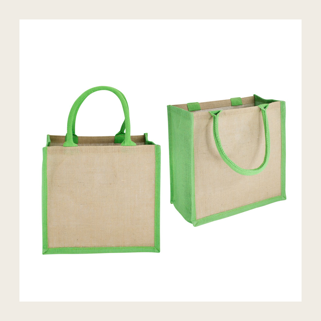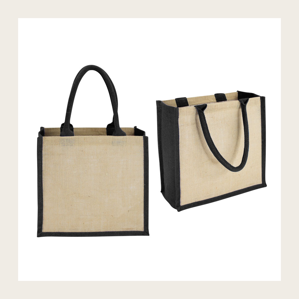 Bolsa de Yute modelo «Rain Forest», con recubrimiento laminado interior. Fuelle de yute teñido color. Manillas de cordón acolchado de yute teñido color de 45 x 1.5 cm. aprox. c/u.