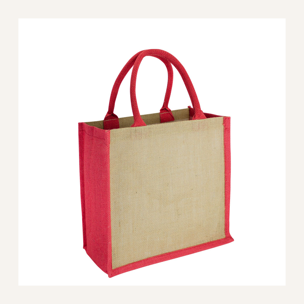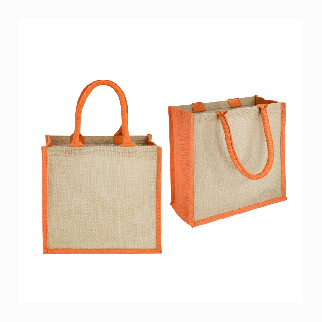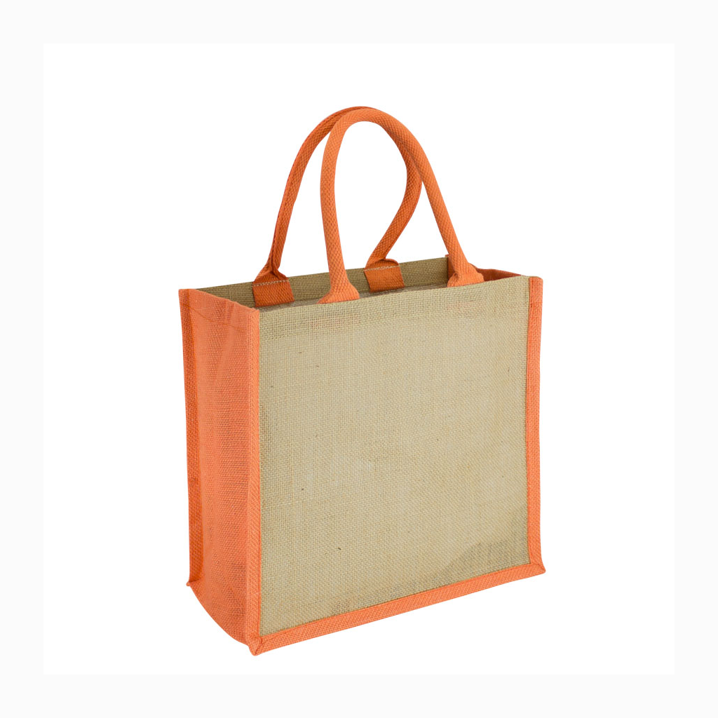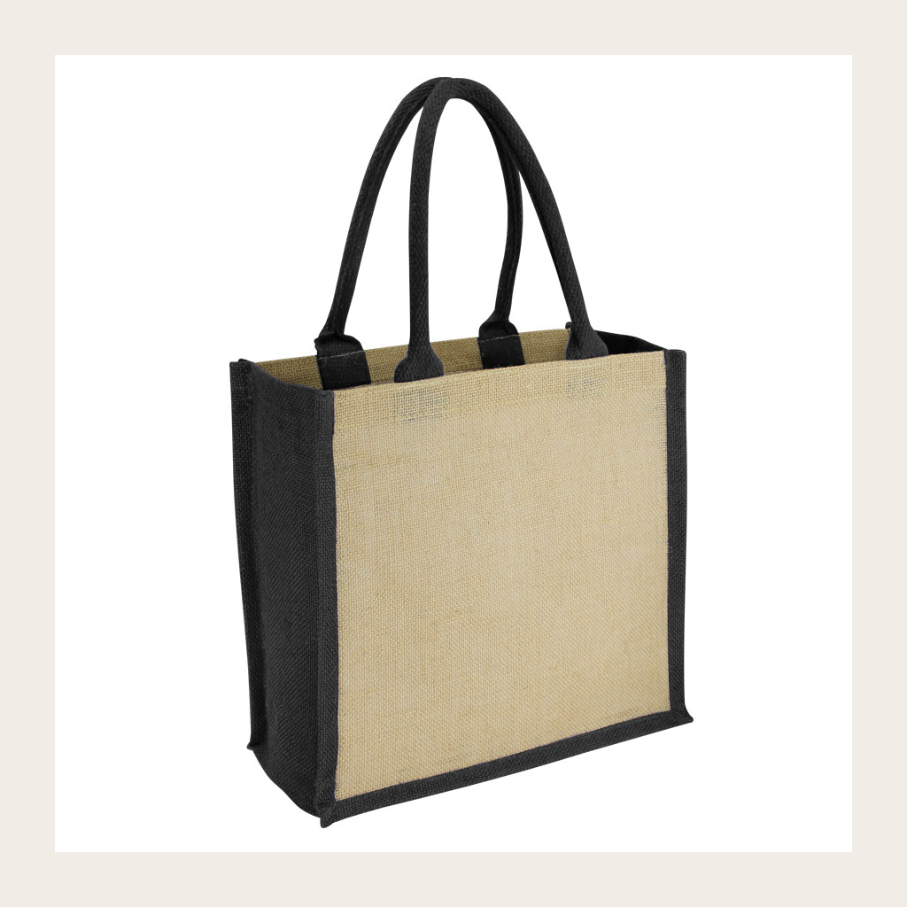 Bolsa de Yute modelo «Rain Forest», con recubrimiento laminado interior. Fuelle de yute teñido color. Manillas de cordón acolchado de yute teñido color de 45 x 1.5 cm. aprox. c/u.
