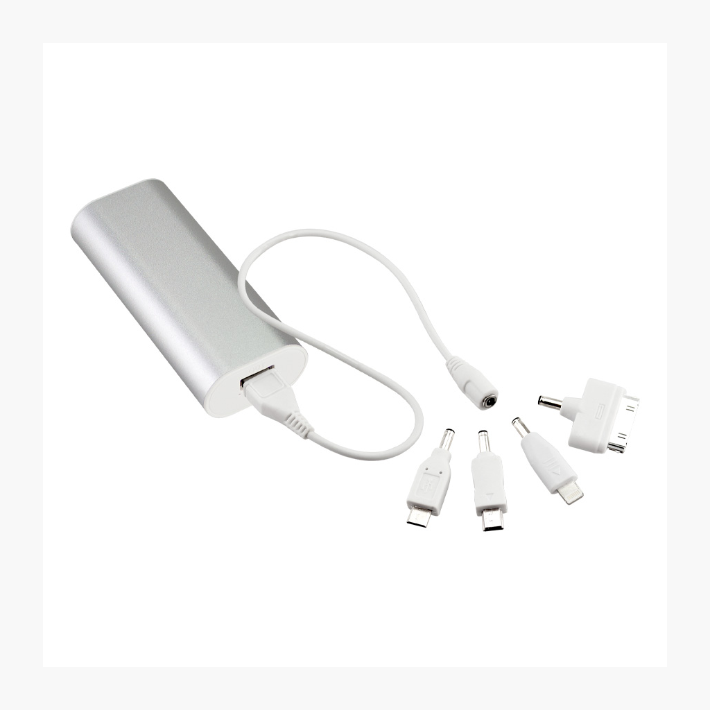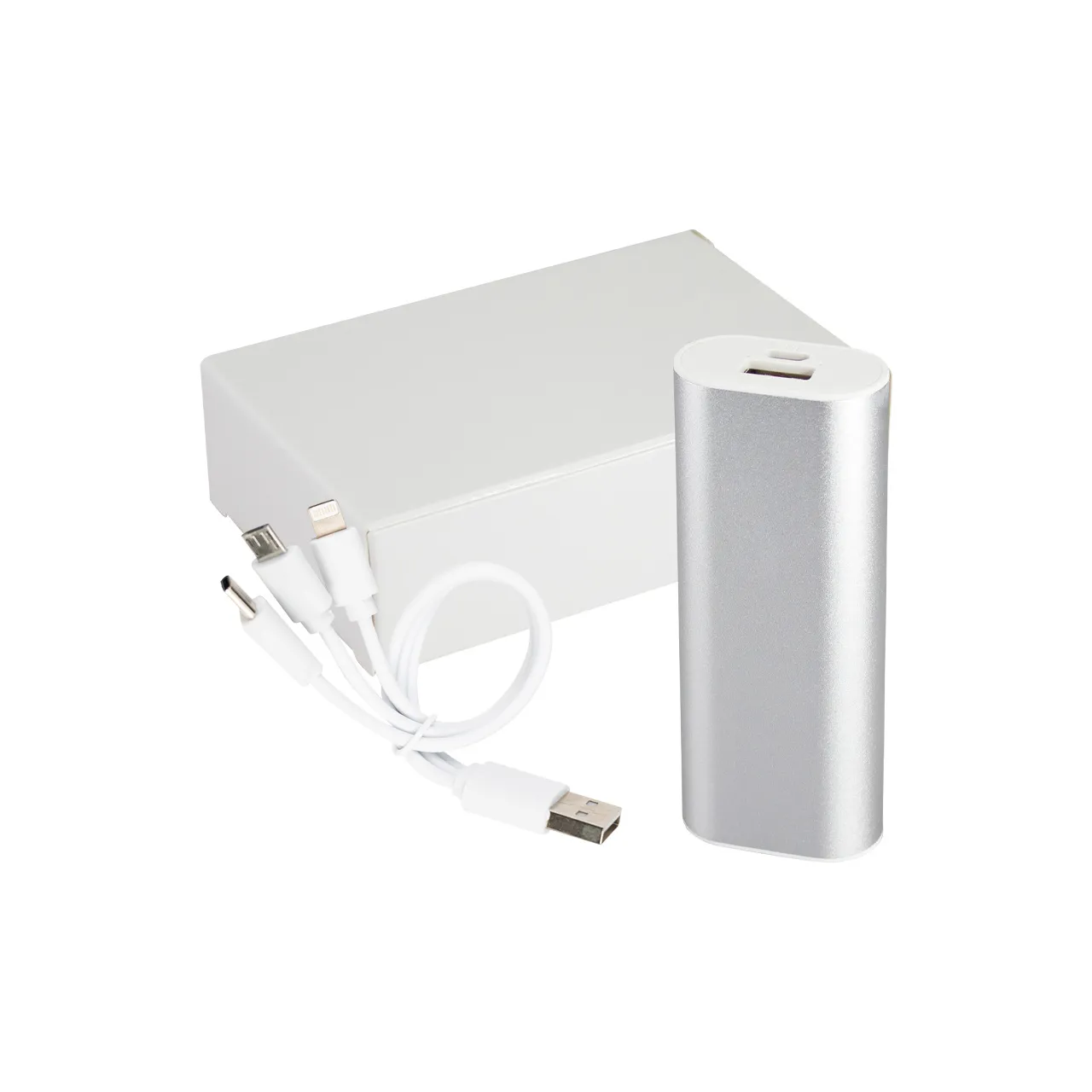Cargador Power Bank USB metálico. Capacidad 5200mAh. Incluye cable USB + 3 adaptadores para Micro-USB, Lightning y Type-C. Batería recargable incorporada. Presentación en caja de regalo laminada blanca.