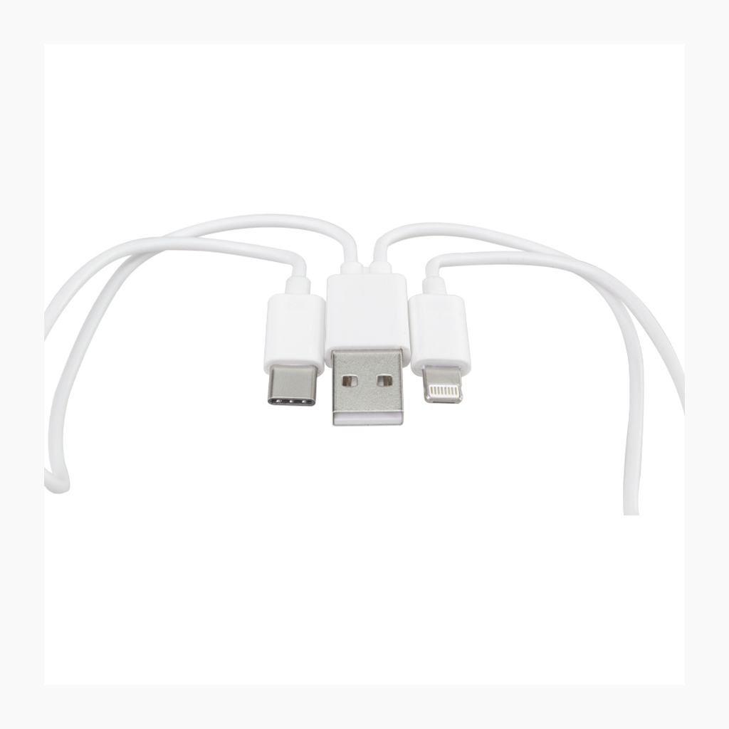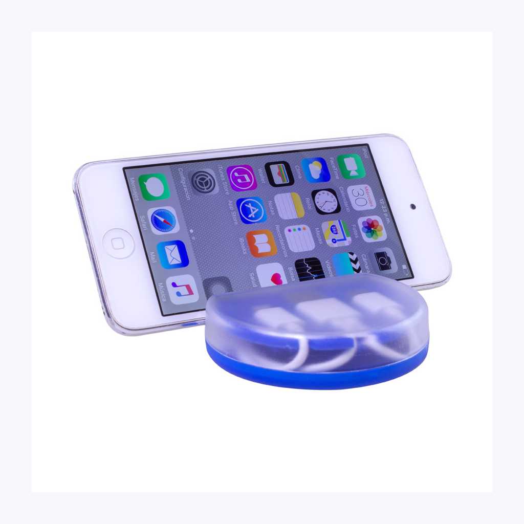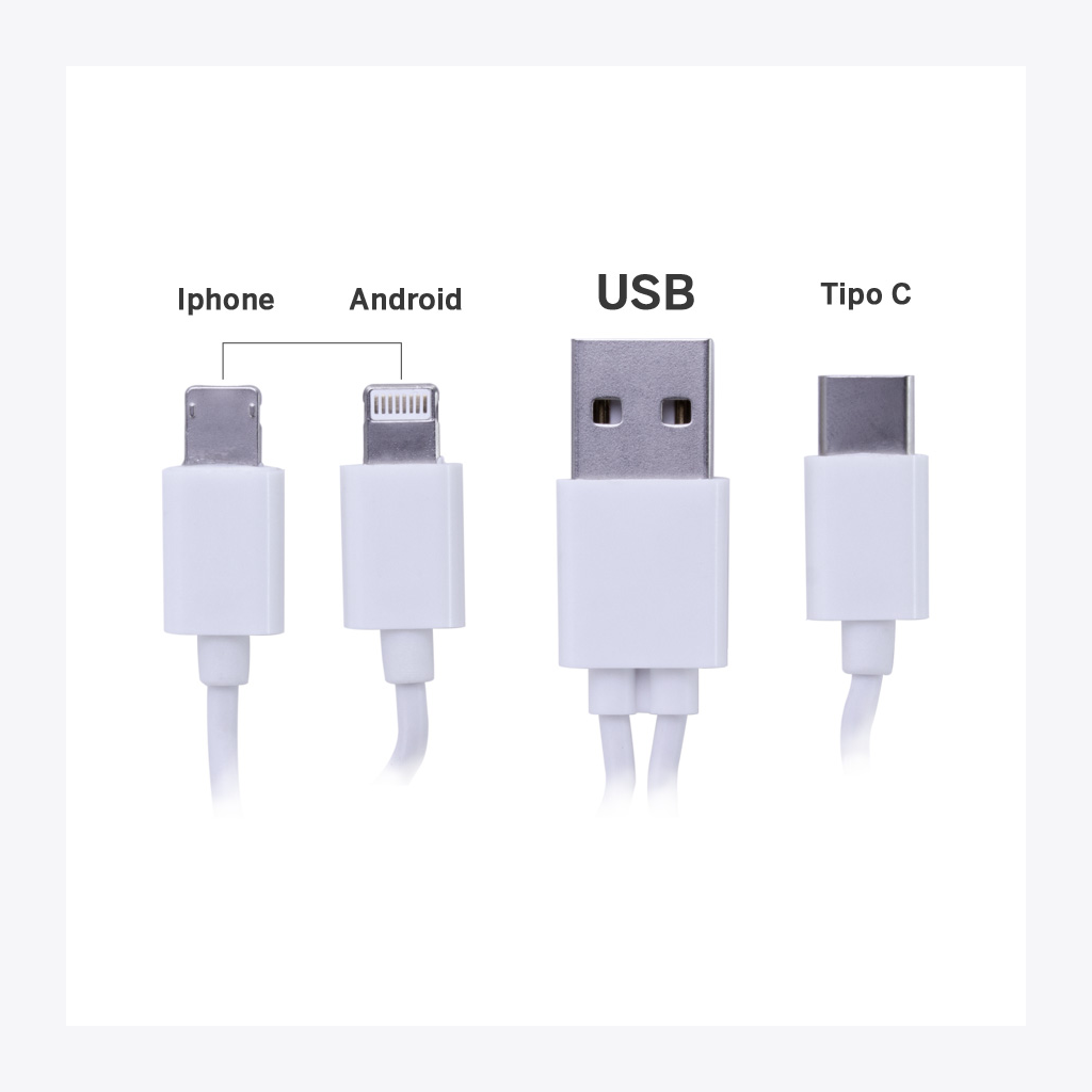 Connect Multicargador 4-en-1, en caja plástica redonda con tapa translúcida y soporte para celular, incluye terminal de carga USB y multicables Micro USB / i-phone / Type C. Incorpora nueva tecnología de cable cargador dual Micro USB y i-phone (en el mismo terminal). Compatible con dispositivos Android, Apple y Type C.
