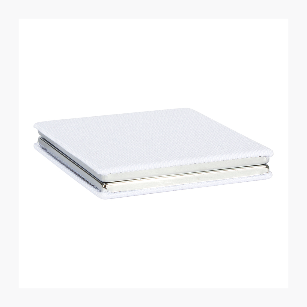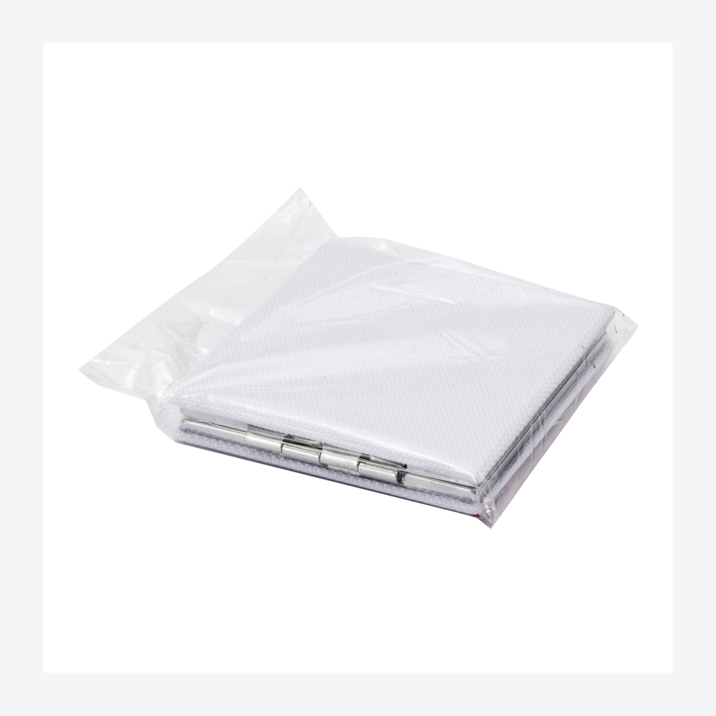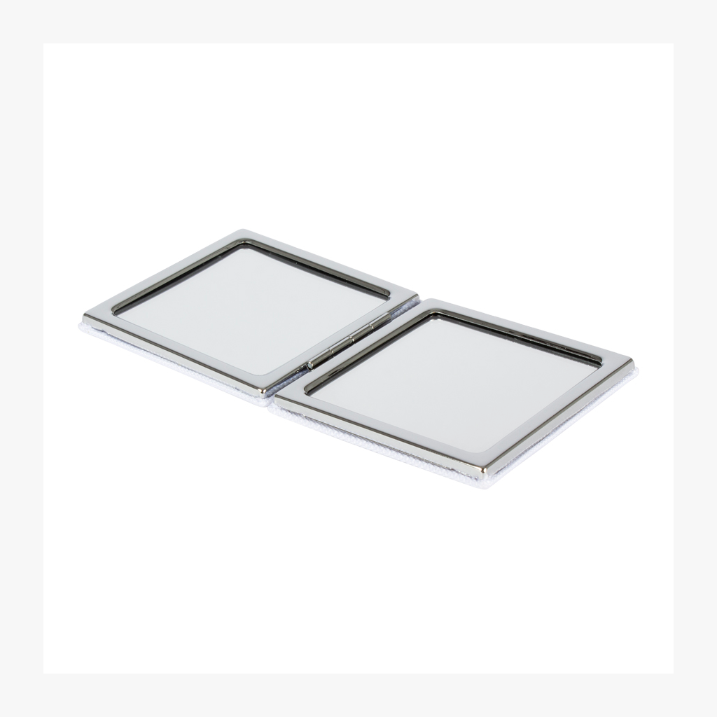 Espejo metálico cuadrado doble, con 2 tapas exteriores recubiertas en poliéster color blanco, para Sublimación. Contiene un espejo normal y el otro con aumento. Sistema de cierre magnético. Presentación en bolsa PP translúcido.