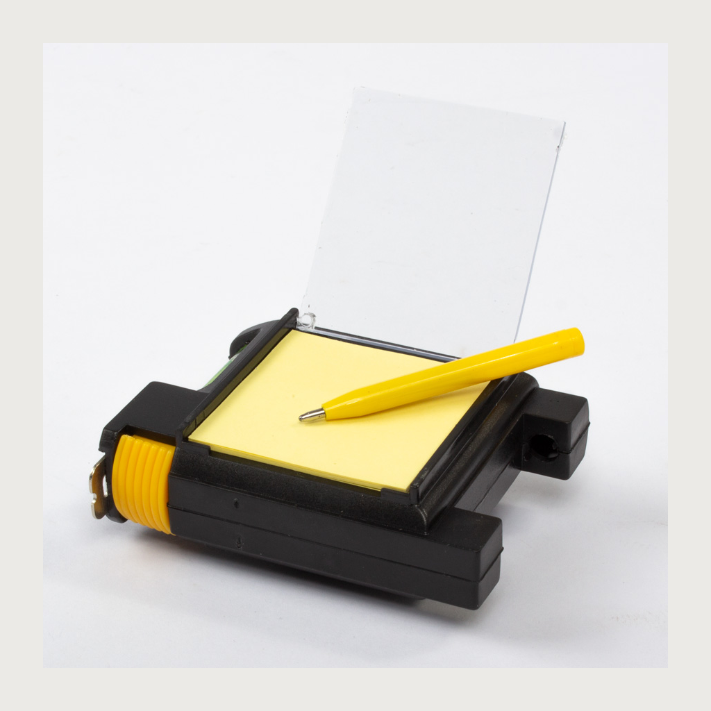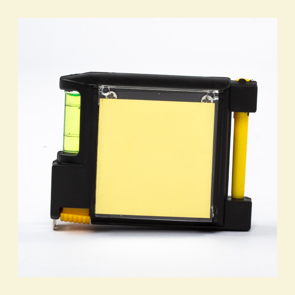 Huincha de medir (metálica-rígida) de 3 mts multifunción. Incluye lápiz pasta, notas adhesivas para apuntes, nivel y abrasadera para bolsillo o cinturón.