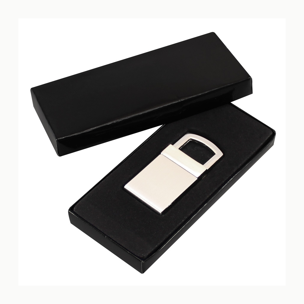 Llavero Metálico modelo «Lock». Presentación en estuche laminado negro con cuna aterciopelada.