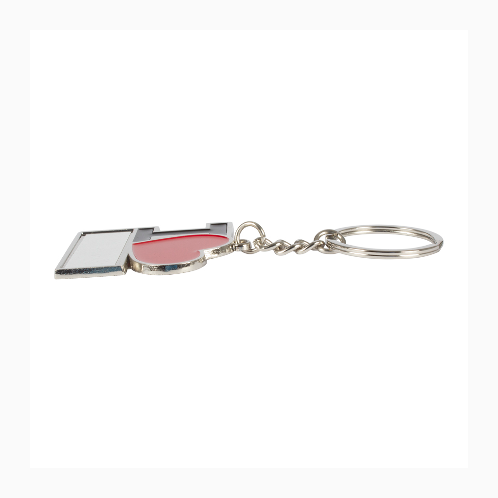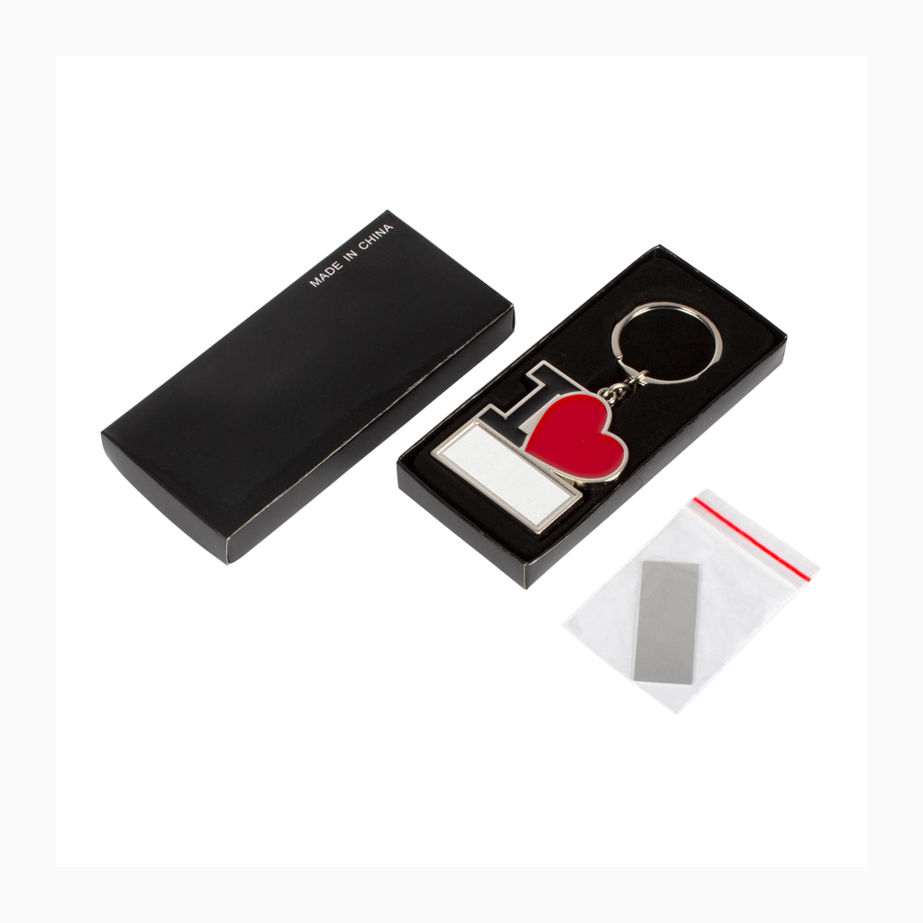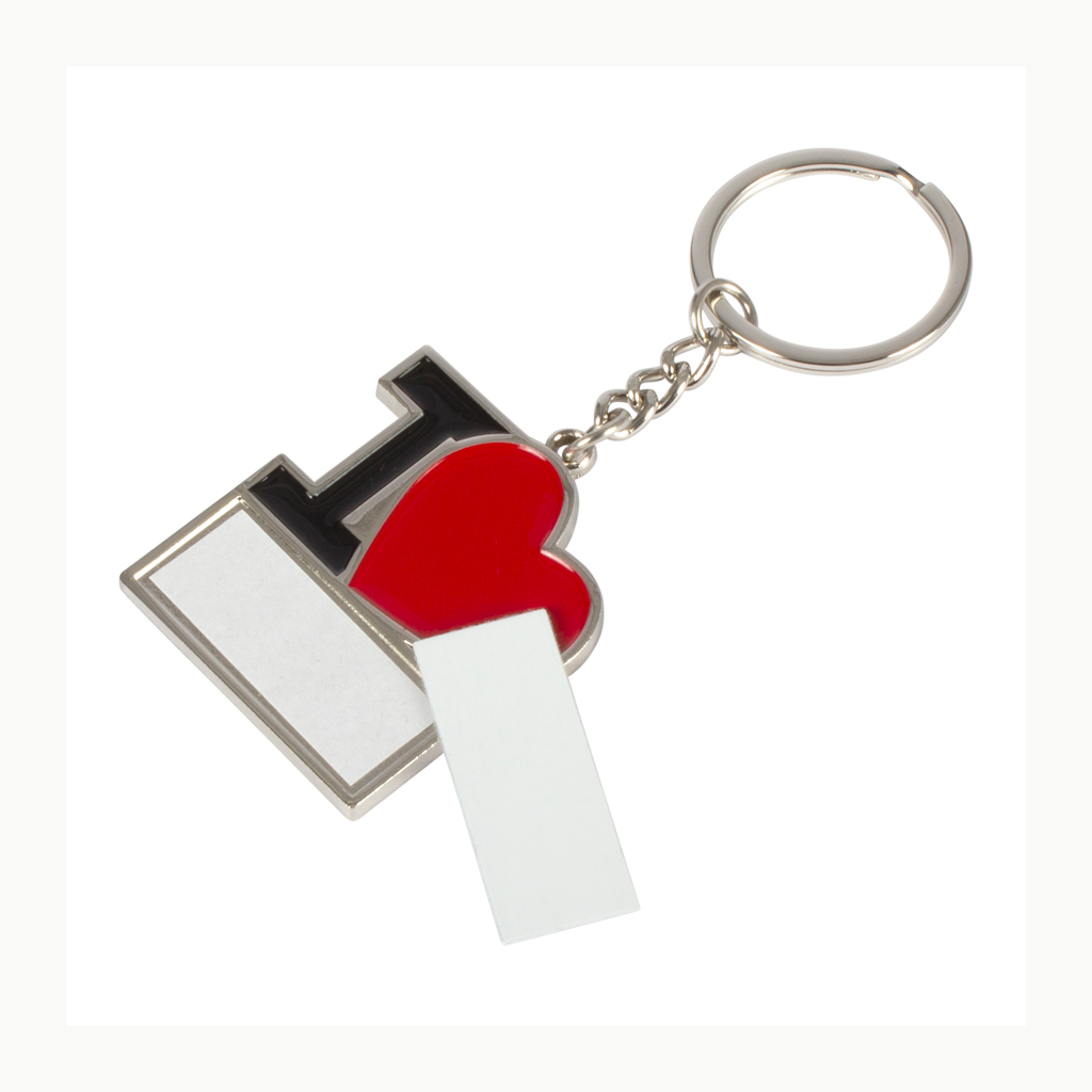 Llavero metálico «I♥», para Sublimación. Incluye argolla llavero de Acero inoxidable. Presentación en estuche negro con cama aterciopelada negra.