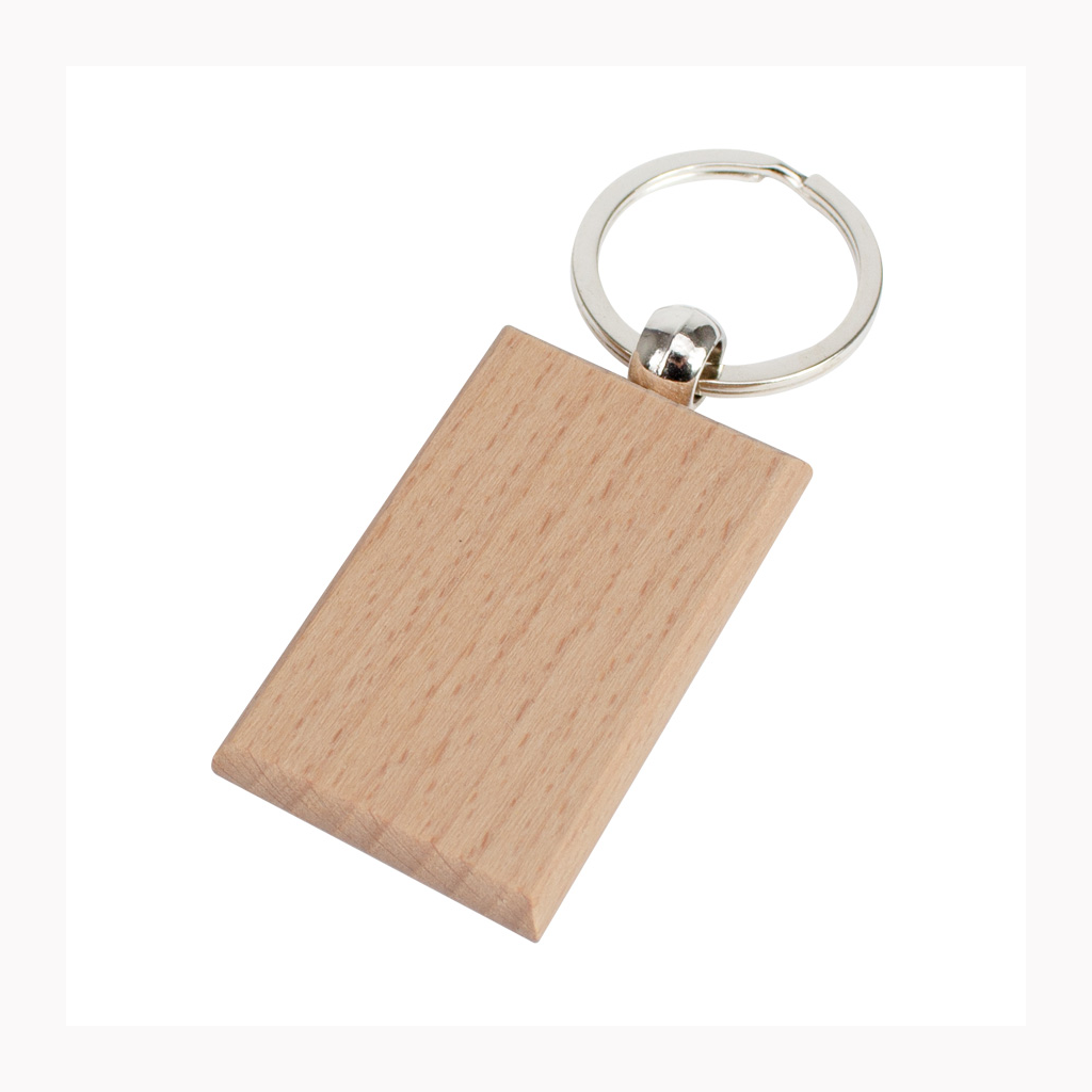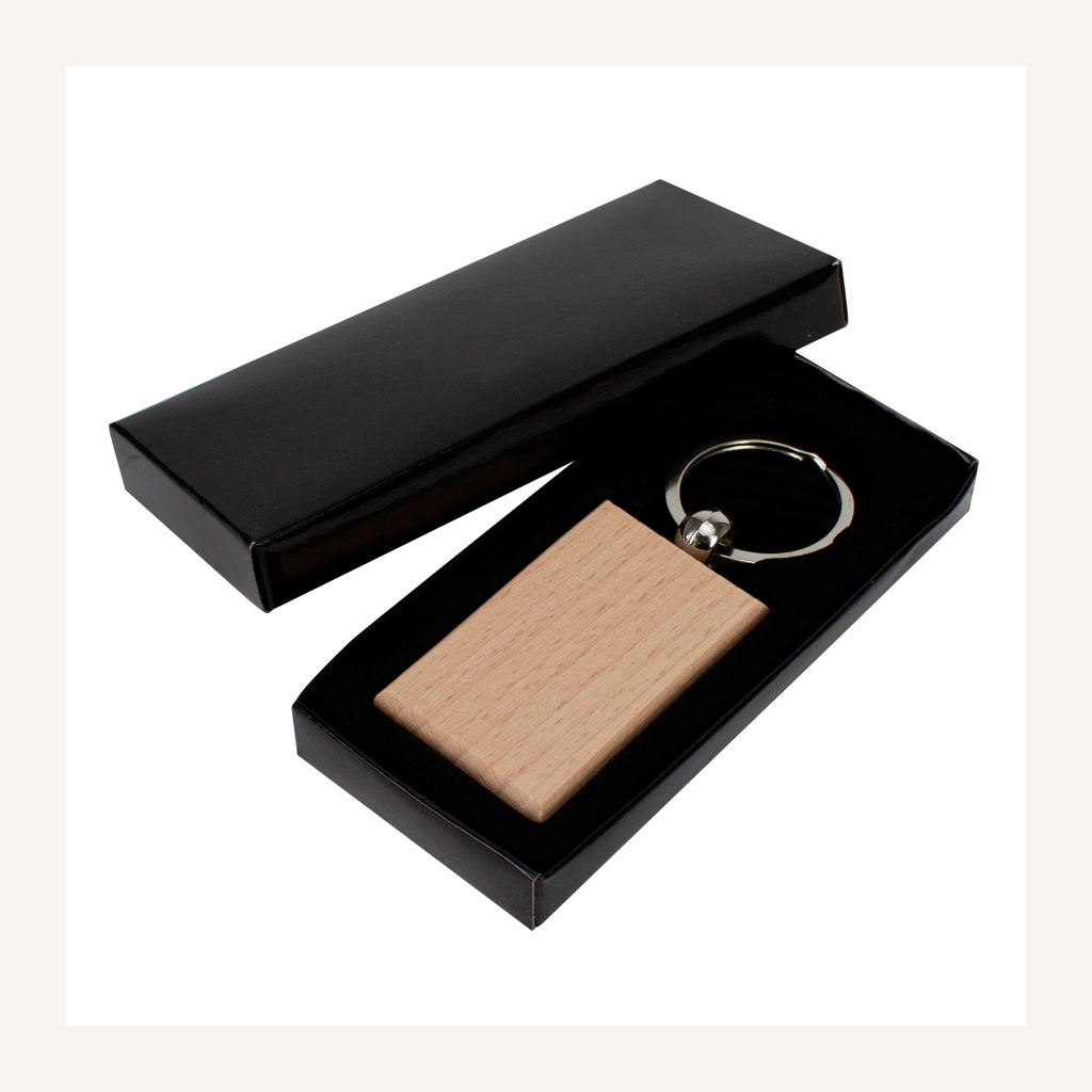 Llavero Rectangular de Madera de Bamboo. Presentación en estuche laminado negro, con cuna aterciopelada.