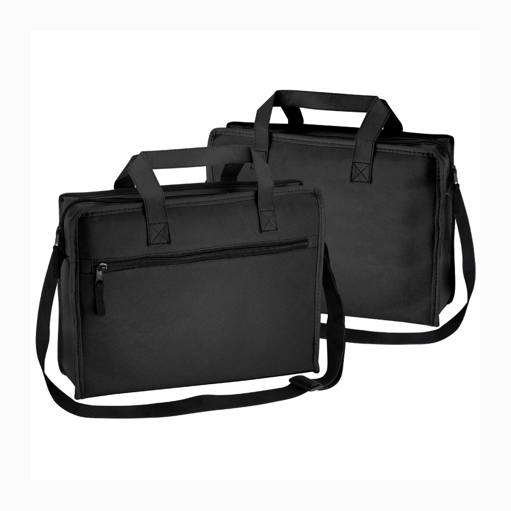Maletín Porta-Documentos, en tela no tejida (TNT) ultra-resistente de 120g/m2. Contiene 2 asas de 38cm. c/u aprox. con costuras reforzadas, cinta para colgar al hombro, base rellena interior de 36 x 9 cm. Compartimento principal + bolsillo delantero, ambos con cierre-eclair negro.