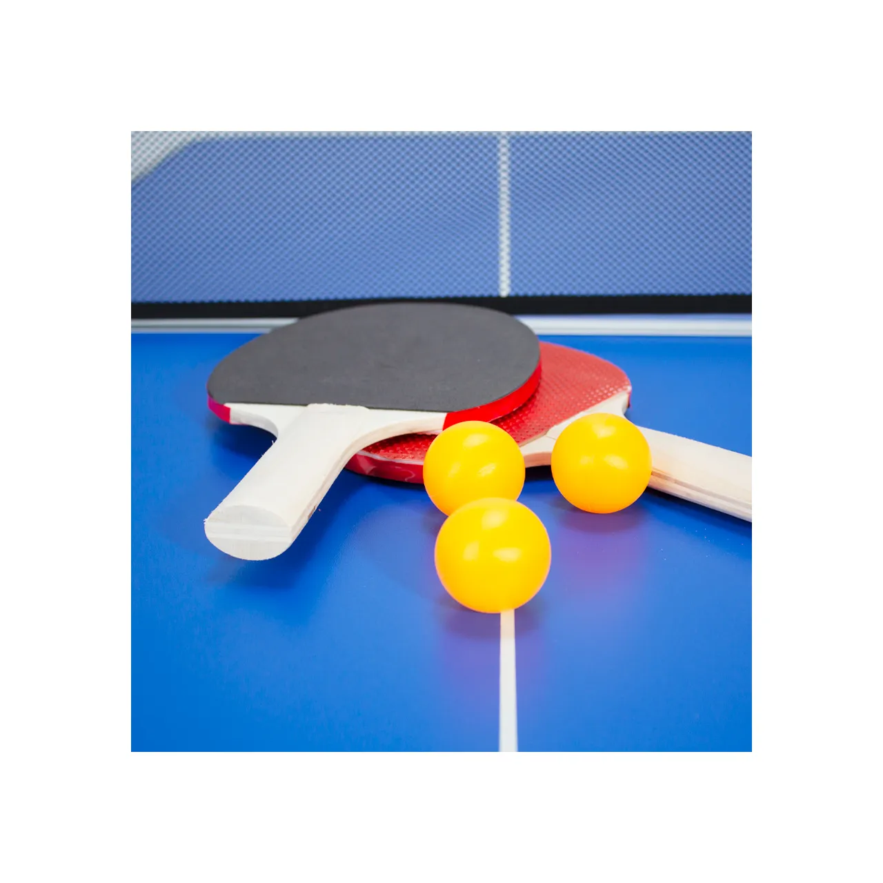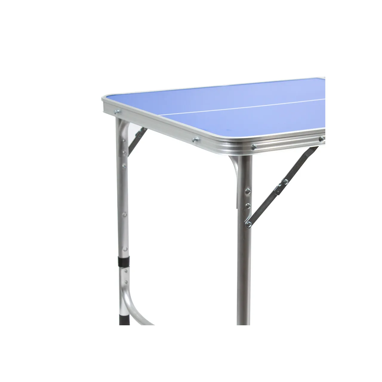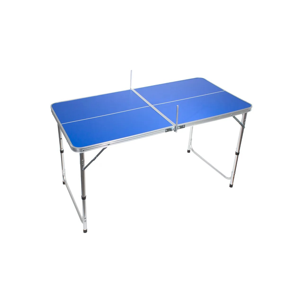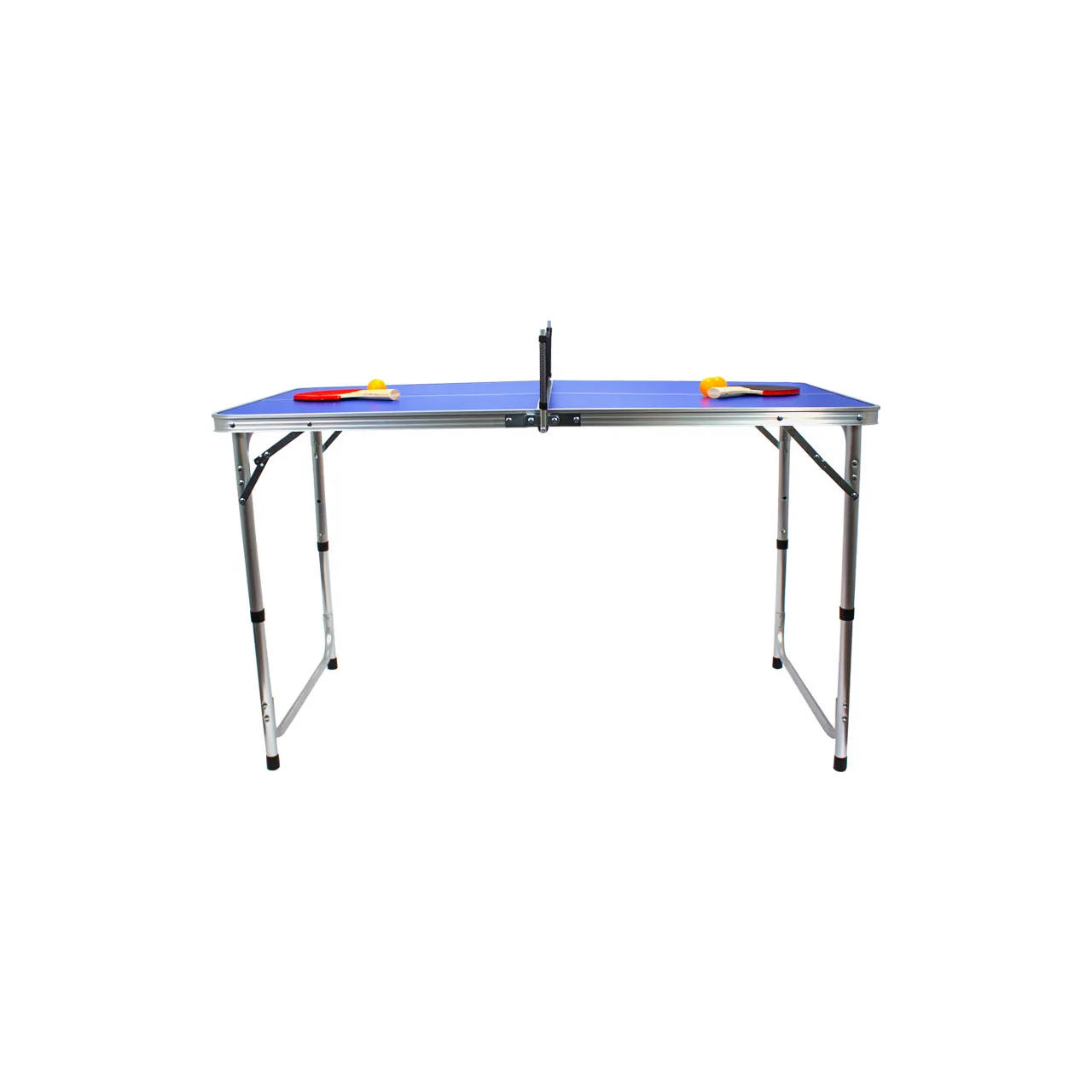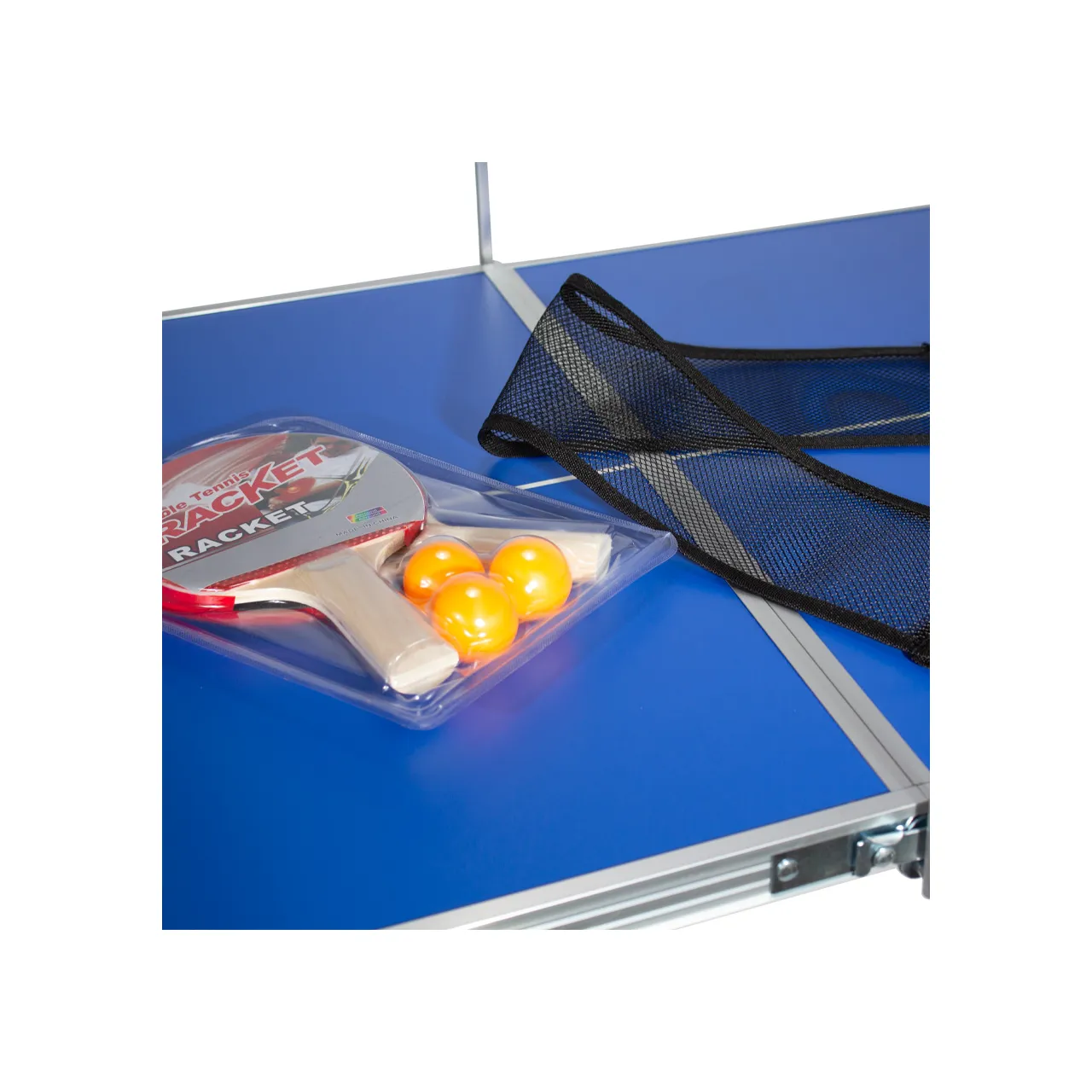 Mesa de Mini Ping-Pong plegable, cubierta azul de MDF 9mm y estructura de aluminio. Incluye 1 red, 2 paletas y 3 pelotas de Ping-Pong.
