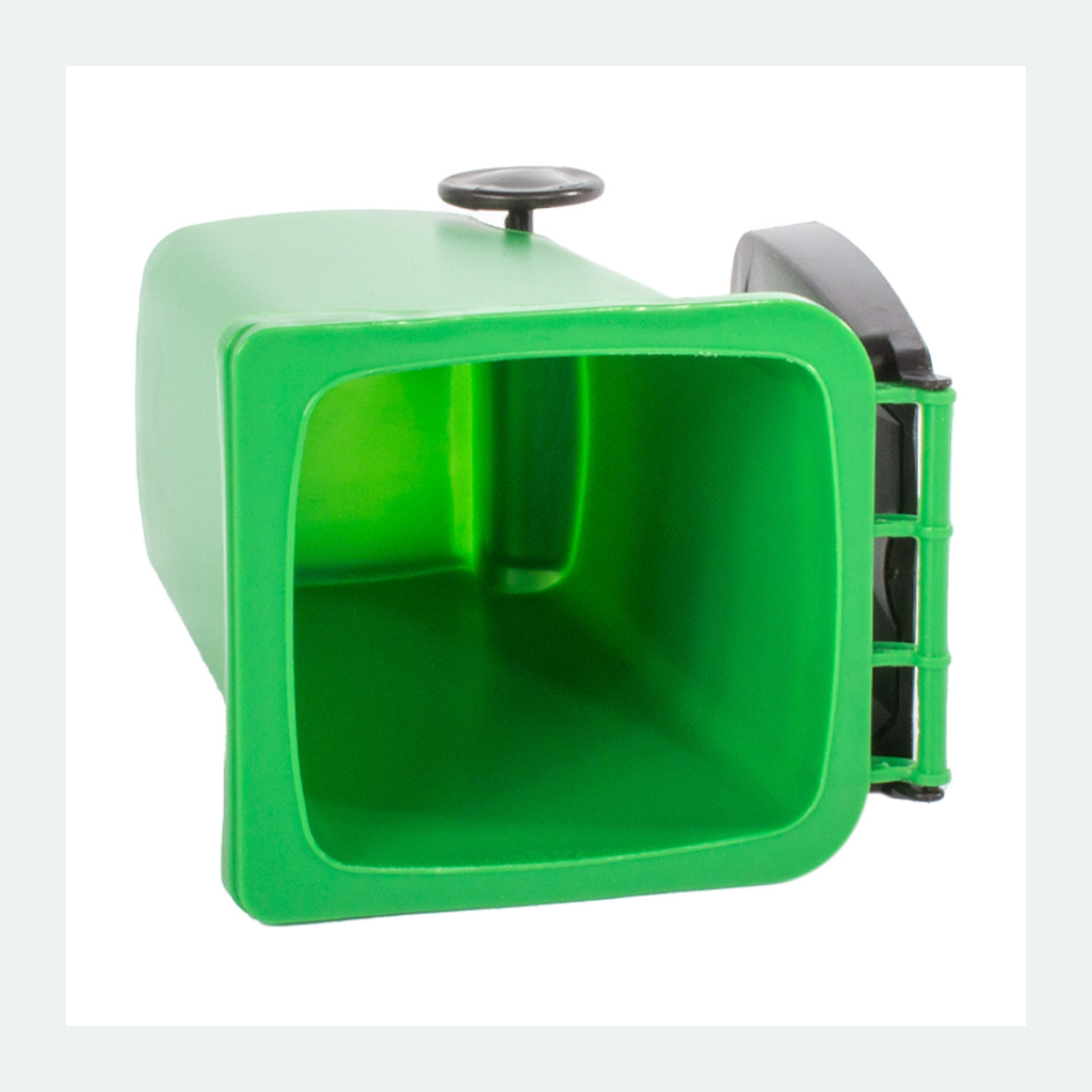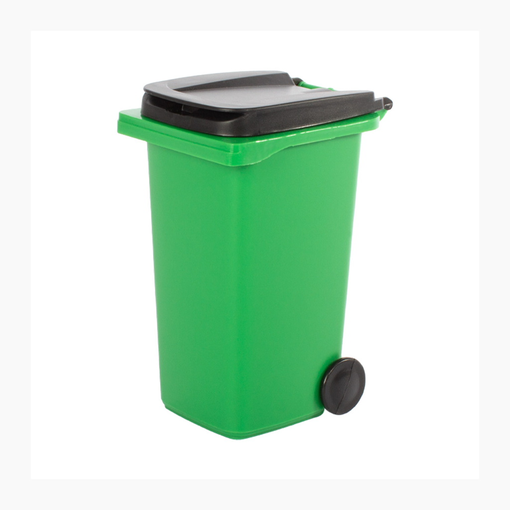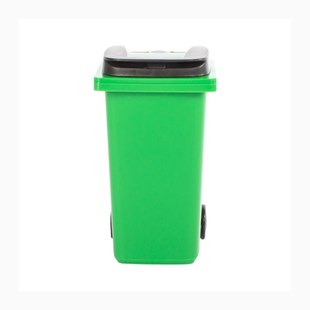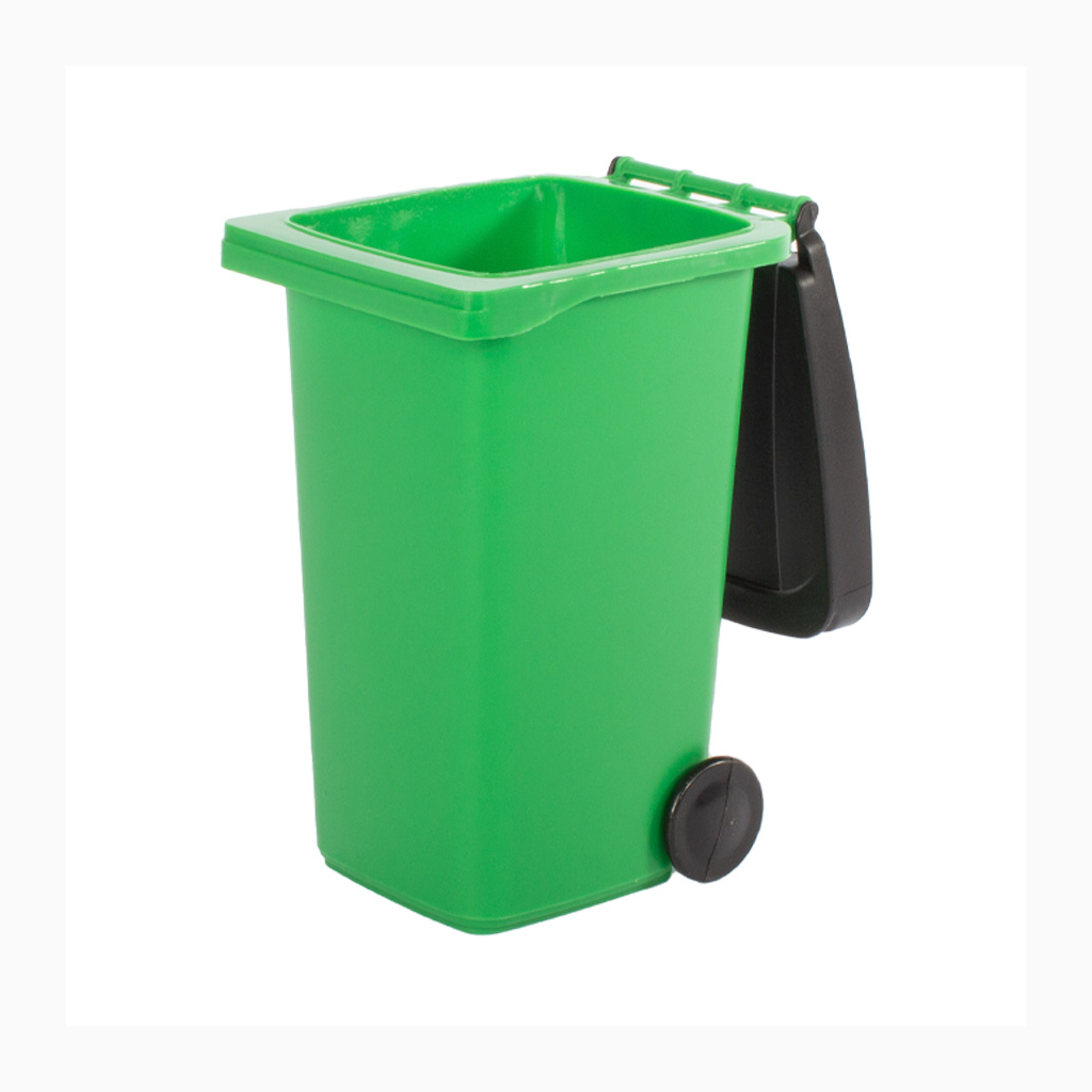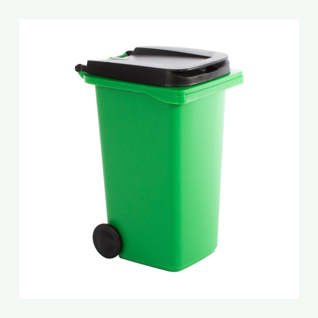 Mini Basurero Verde de Sobremesa plástico verde, con tapa y ruedas negras.