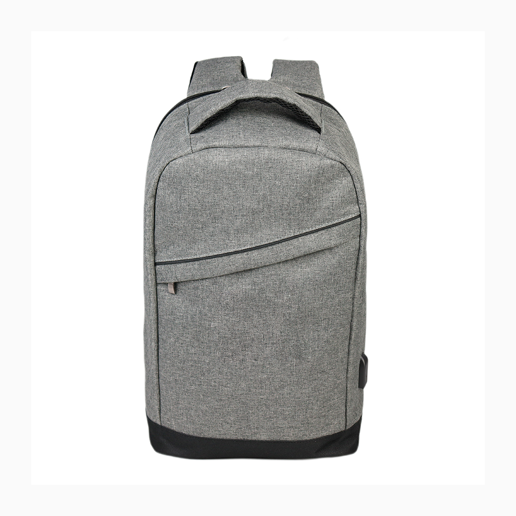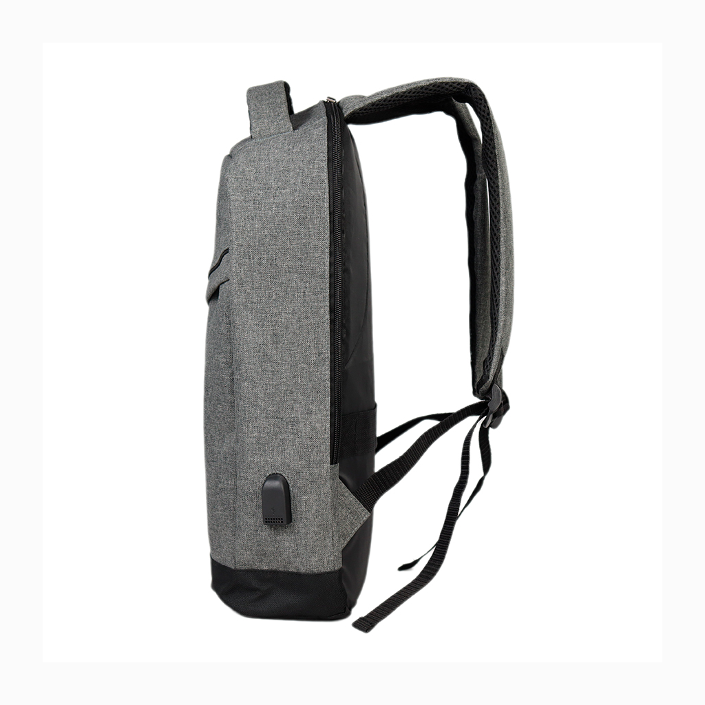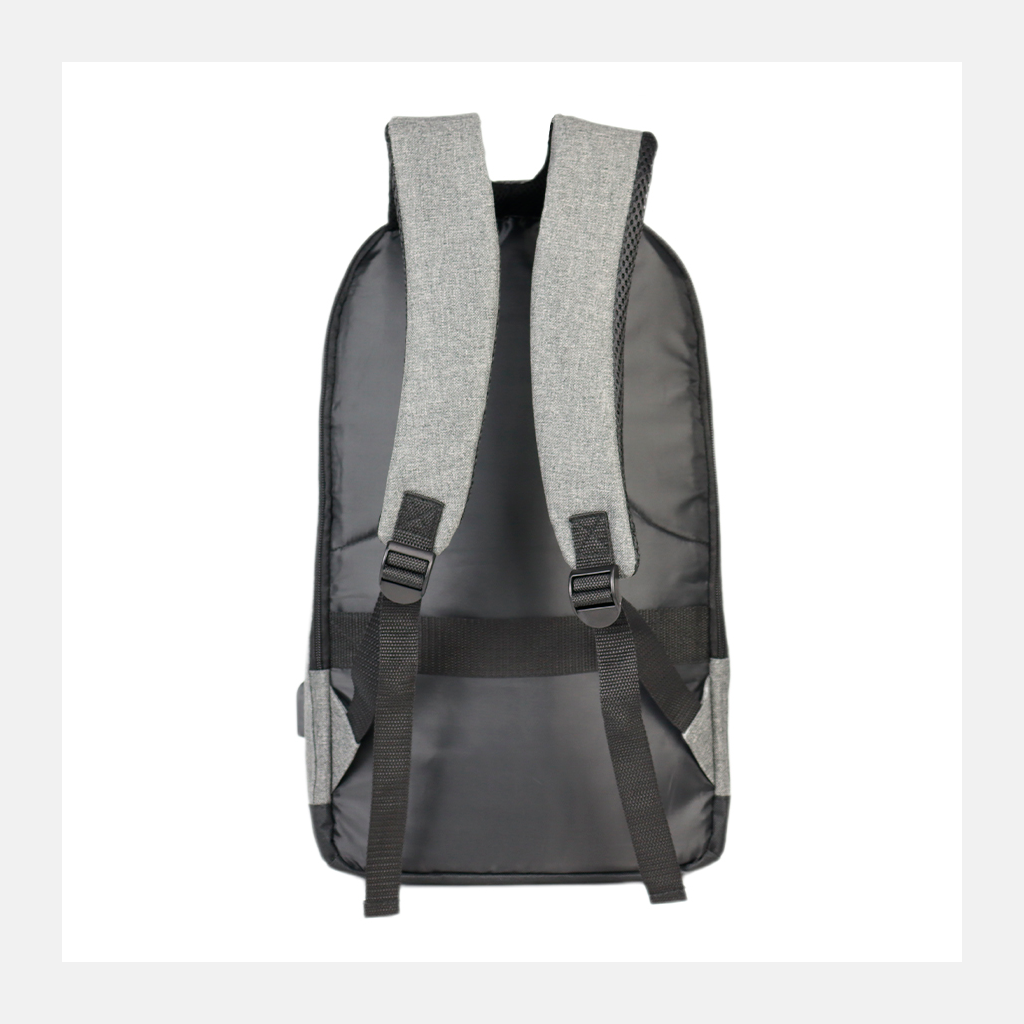 Mochila Porta-Notebook modelo «TECH». Fabricada en poliéster 600D/PVC bitono y PU 210D. Capacidad 14 litros, tamaño 26.5 x 44 x 12 cm. Incluye compartimento interior reforzado y acolchado para Laptop, bolsillo delantero y terminal de salida para cable USB.