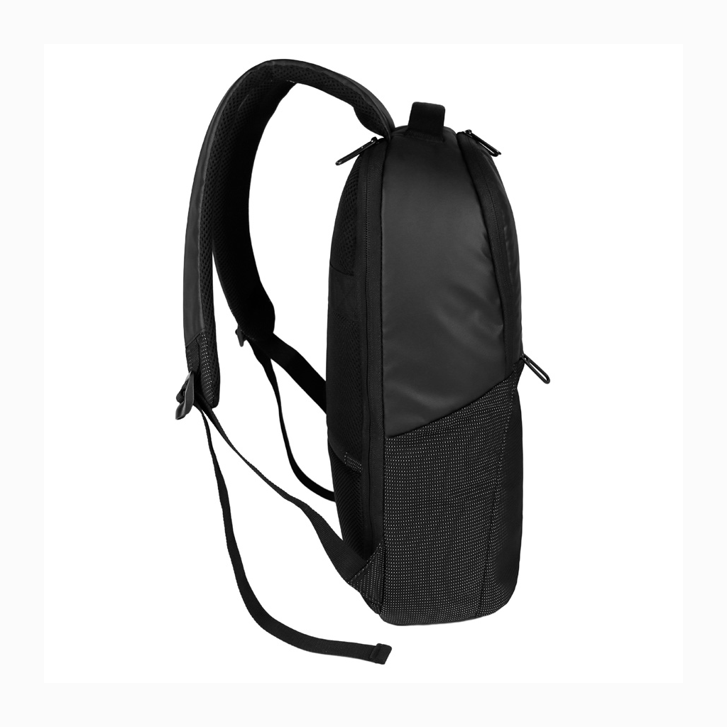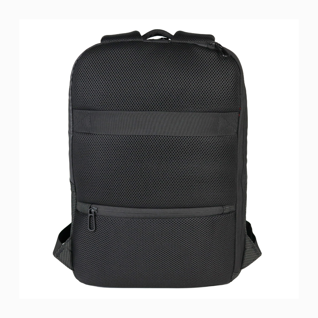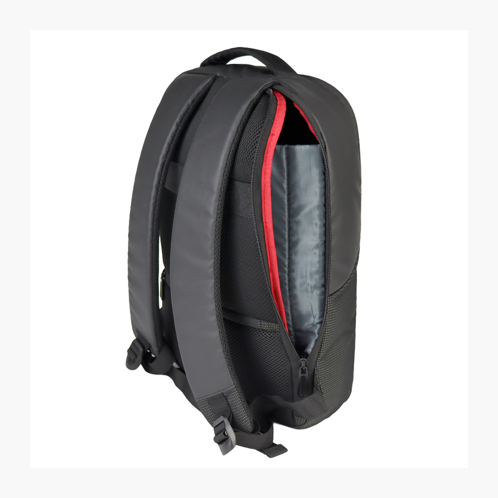 Deluxe Mochila Porta-Notebook modelo «WENZER». En tela poliéster mallado con membrana epitelial + eco-cuero PU 840D. Capacidad 16 litros, tamaño 30 x 44 x 12 cm. Cuenta con compartimiento delantero para notebook y tablet, + bolsillo delantero + compartimento principal con apertura posterior lateral (en vertical) de seguridad, para acceso directo a la notebook. Sujetador de Carry-on. Espaldar y correas regulables acolchados, y un cuarto compartimento (bolsillo) en el espaldar, para guardar elementos pequeños con máxima seguridad anti-robos.