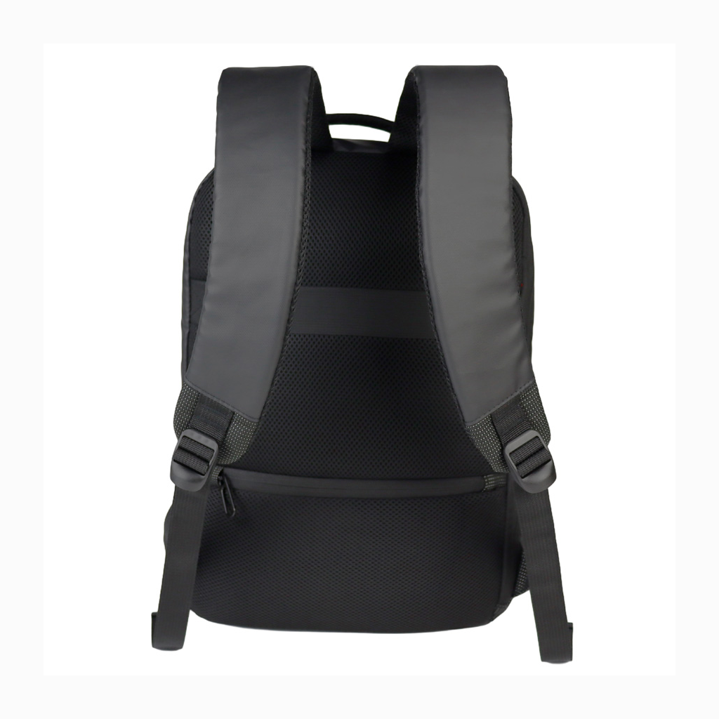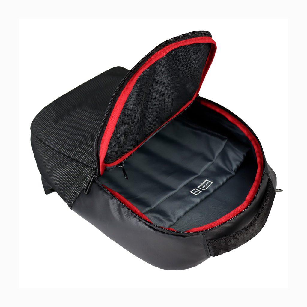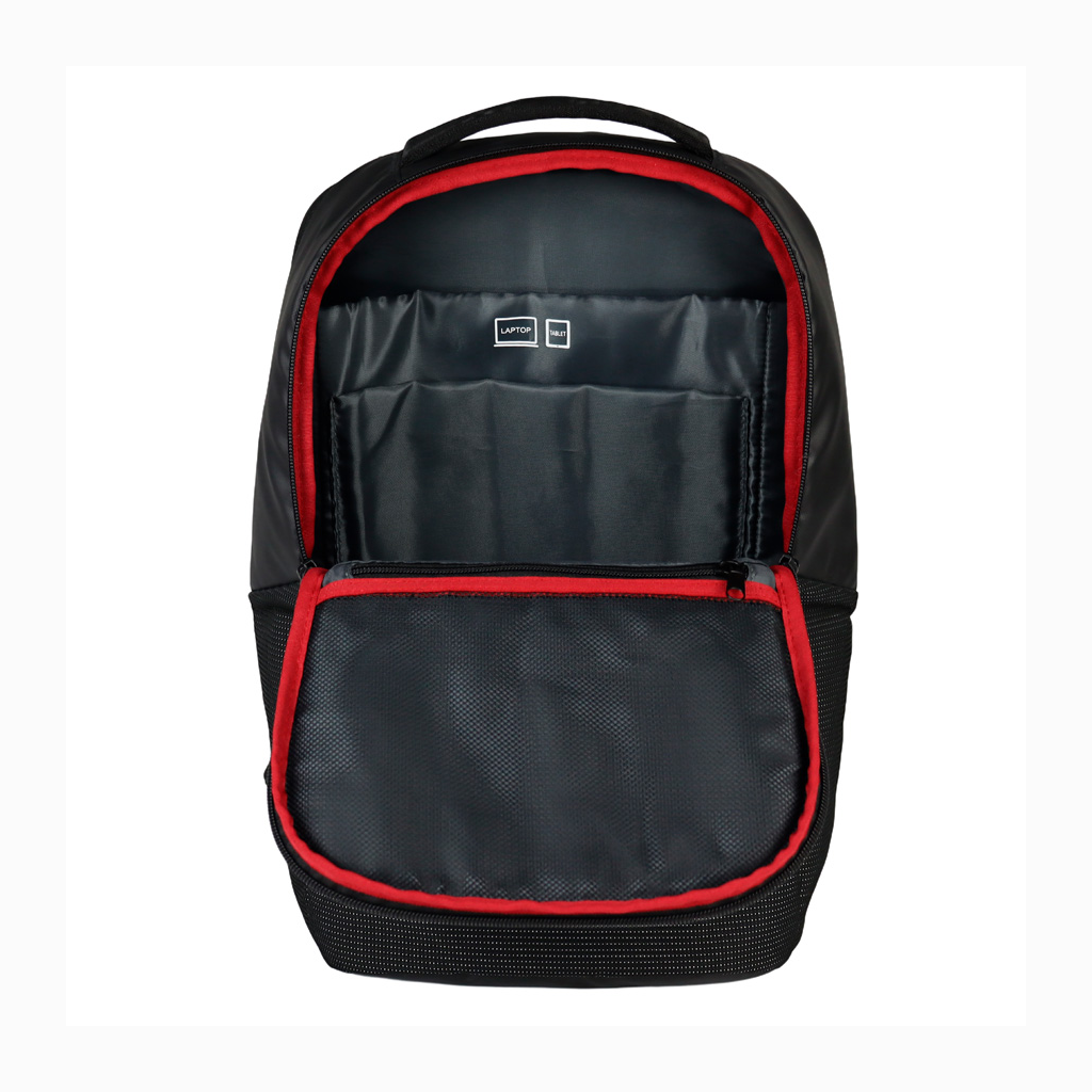 Deluxe Mochila Porta-Notebook modelo «WENZER». En tela poliéster mallado con membrana epitelial + eco-cuero PU 840D. Capacidad 16 litros, tamaño 30 x 44 x 12 cm. Cuenta con compartimiento delantero para notebook y tablet, + bolsillo delantero + compartimento principal con apertura posterior lateral (en vertical) de seguridad, para acceso directo a la notebook. Sujetador de Carry-on. Espaldar y correas regulables acolchados, y un cuarto compartimento (bolsillo) en el espaldar, para guardar elementos pequeños con máxima seguridad anti-robos.