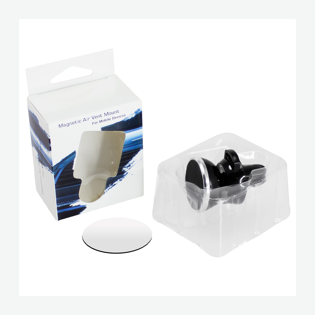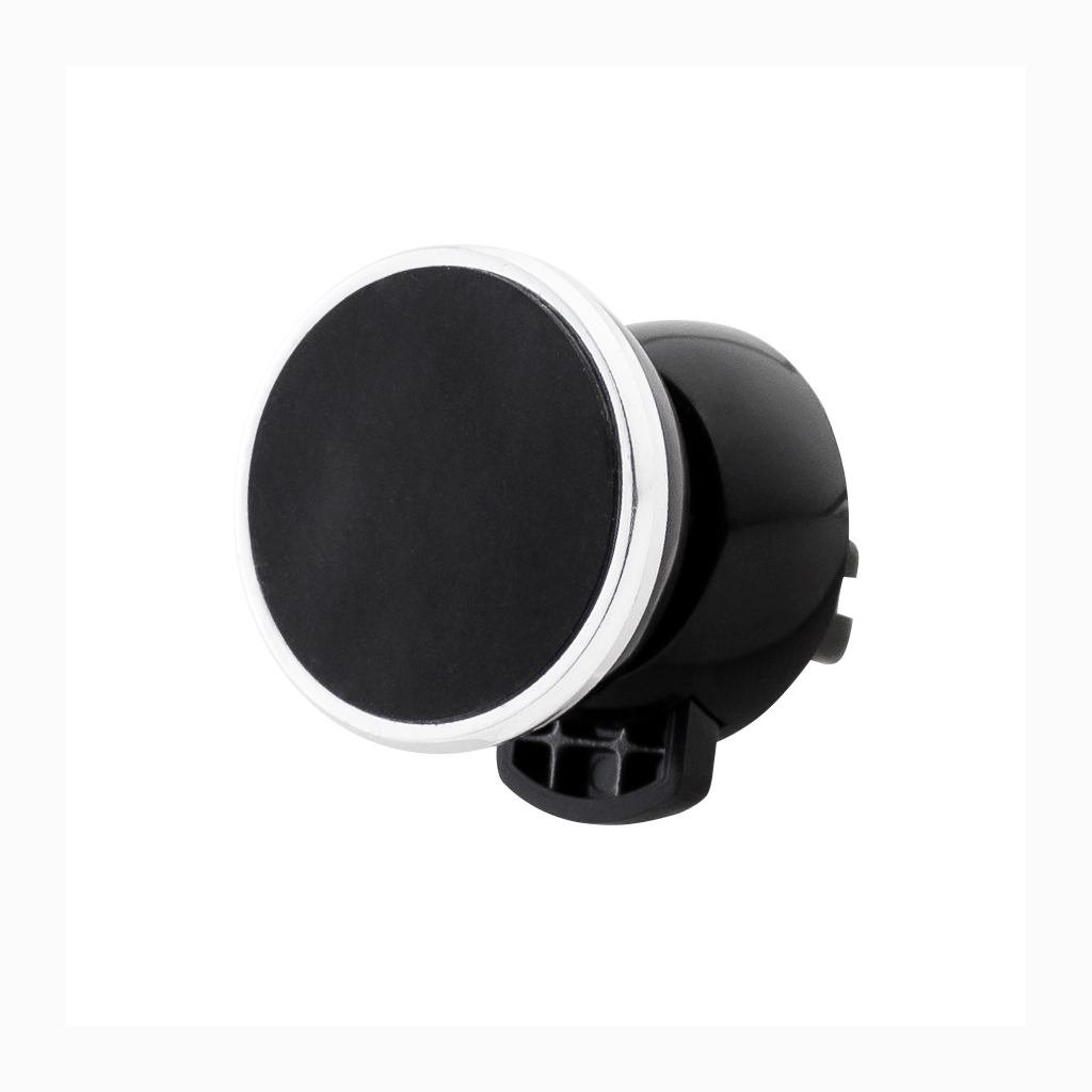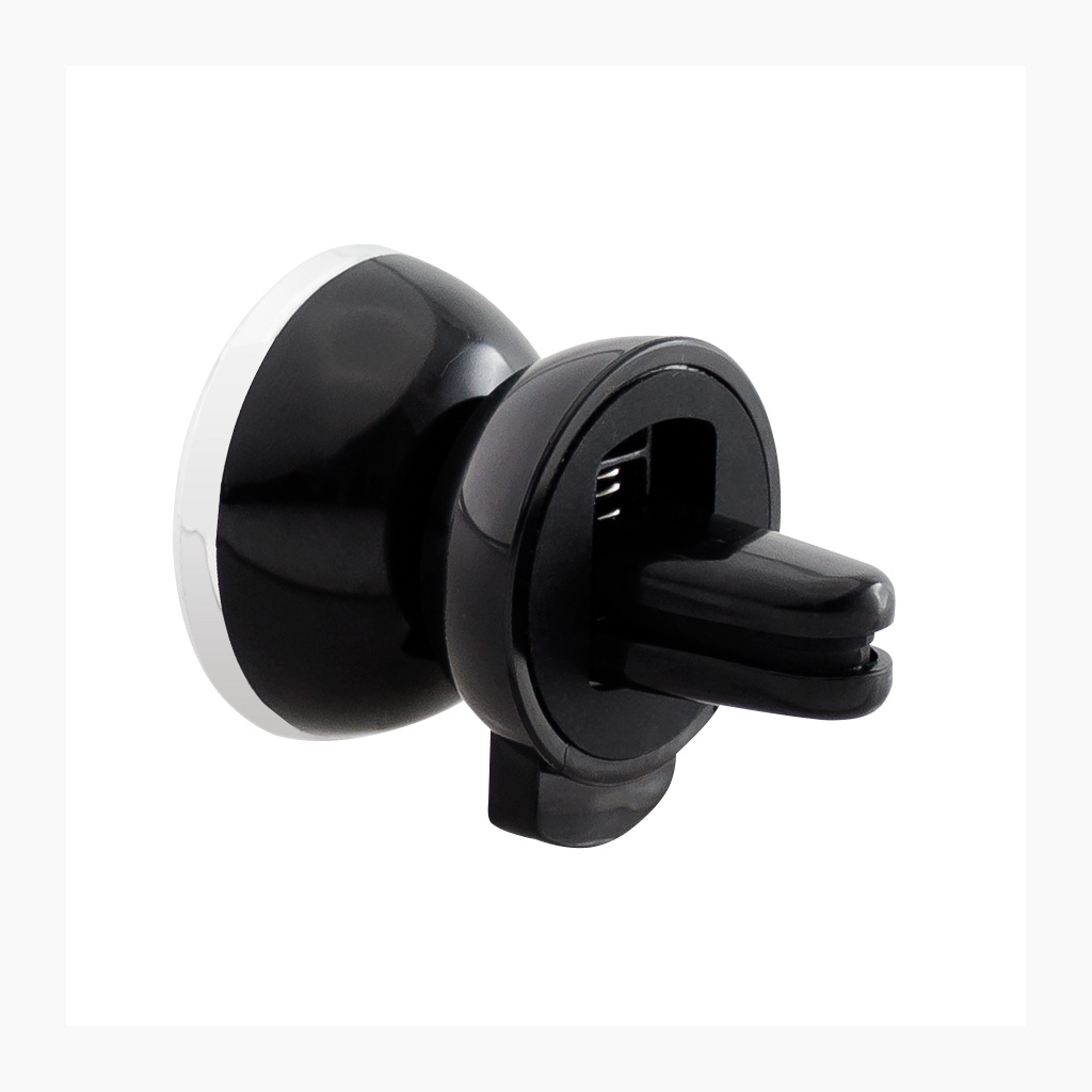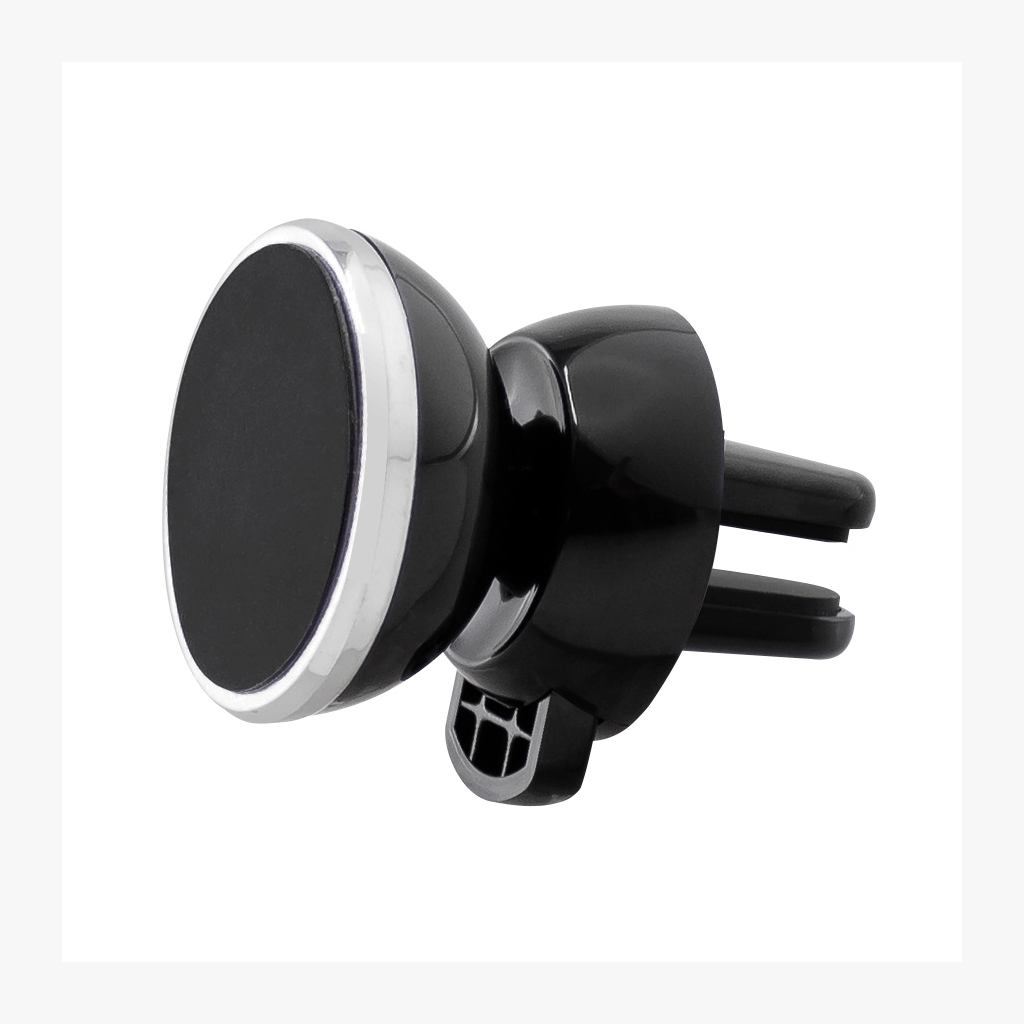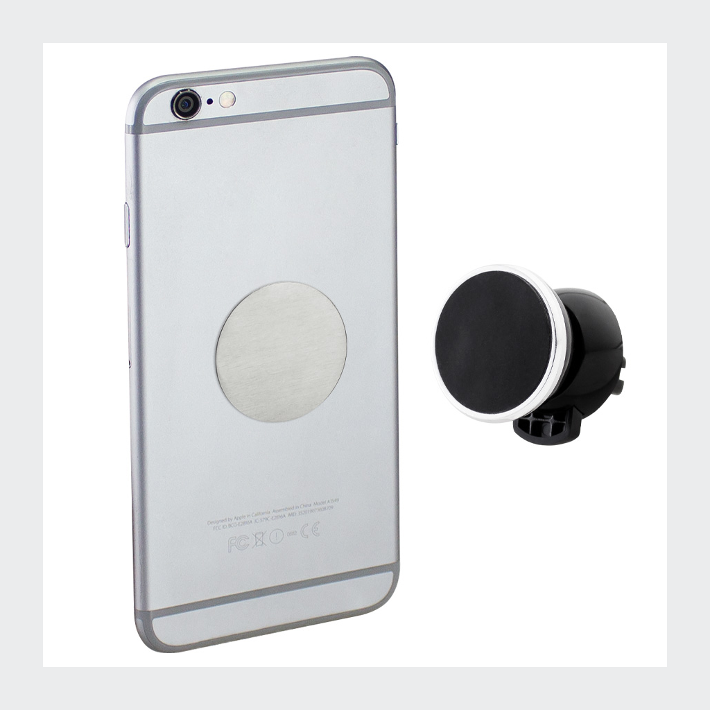 Porta-Celular magnético, con soporte para rejilla de ventilador del vehículo. Contiene placa redonda metálica con adhesivo posterior, para pegar a los celulares (más antiguos) que no cuentan con material magnético built-in. Esta placa redonda se puede grabar, previamente a ser pegada en el celular.