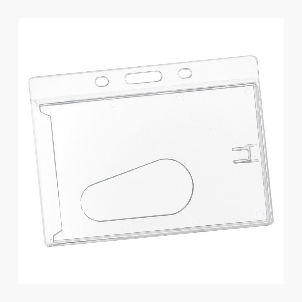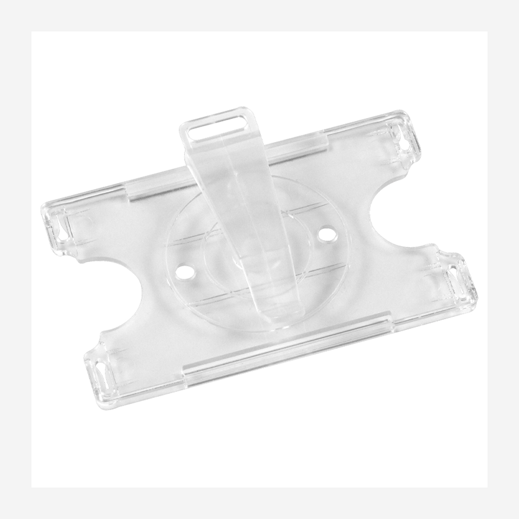 Porta-Credencial de Acrílico, para Credenciales tamaño Tarjeta de Crédito. Visibilidad por un solo lado. Con clip giratorio posterior de doble función, para presentación vertical u horizontal.