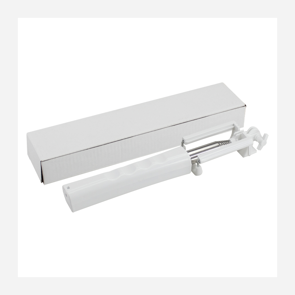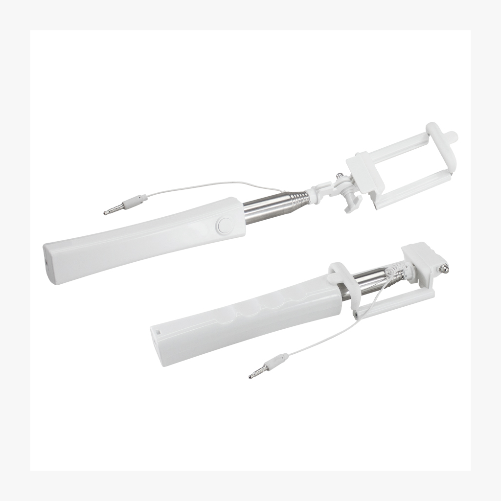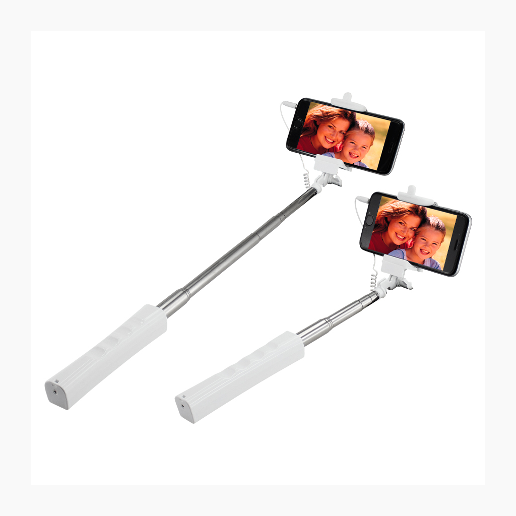 Palo extensible para Selfie «Monopod». Largo alcance de 150cm. con tu brazo extendido. Extensión total selfie-stick desplegado: 95cm. Cerrado: 30cm. Mango plástico blanco con buen área de impresión. Contiene cable de conexión y botón de disparo. No requiere aplicaciones extras para disparo.