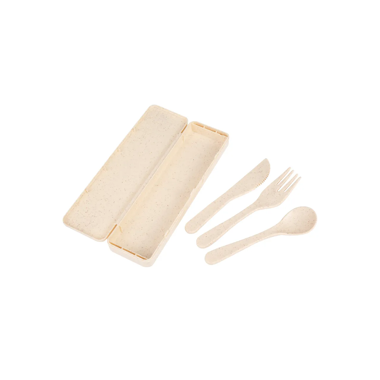 Set de 3 cubiertos en Estuche, fabricados en PP y Wheat Straw, pasta de caña (paja) de trigo, un material sustentable que reduce la huella de Carbono en nuestro planeta. Producto libre de BPA. Presentación en estuche del mismo material PP y Wheat Straw. Cubiertos: Cuchillo, Tenedor, Cuchara.