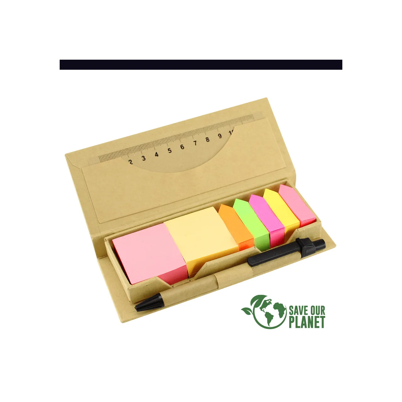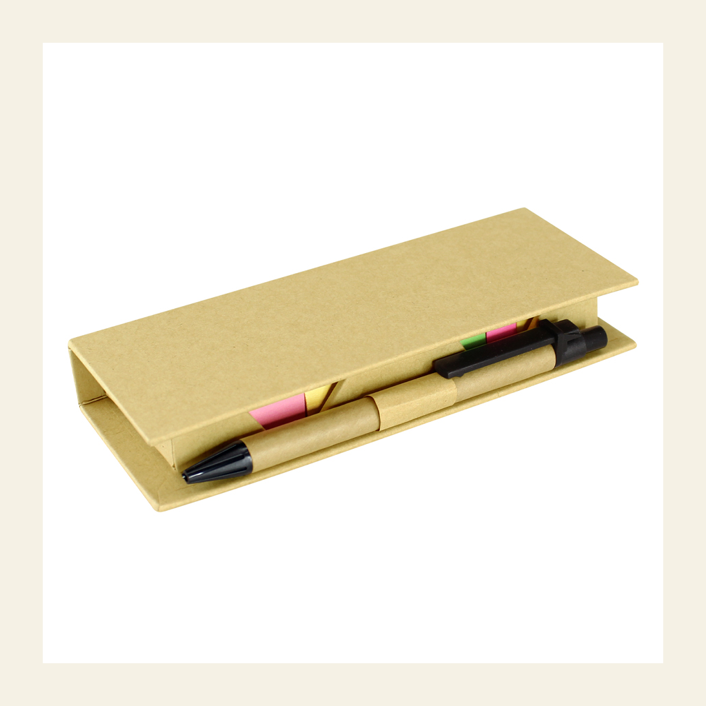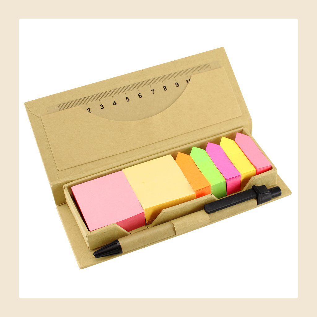 Memo Set Ecológico con Bolígrafo Ecológico escritura negra, Regla 12 cm, notas y banderitas adhesivas. Incluye 300 notas adhesivas cuadradas + 750 banderitas adhesivas de colores.