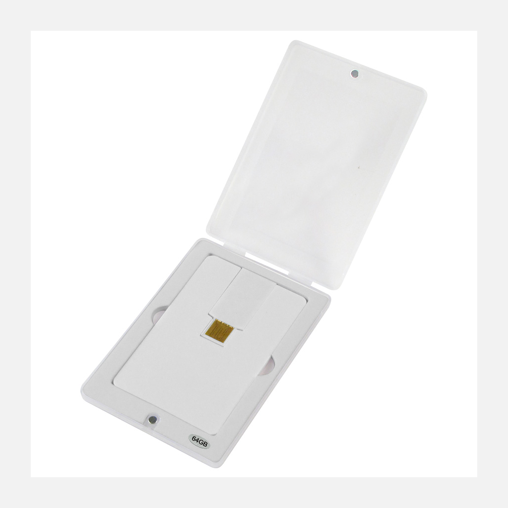Pendrive memoria de 64GB, forma y tamaño Tarjeta de Crédito 100% blanco, con USB 2.0 twist-system. Presentación en elegante estuche de plástico translúcido, dentro de cuna de esponja EVA blanca.