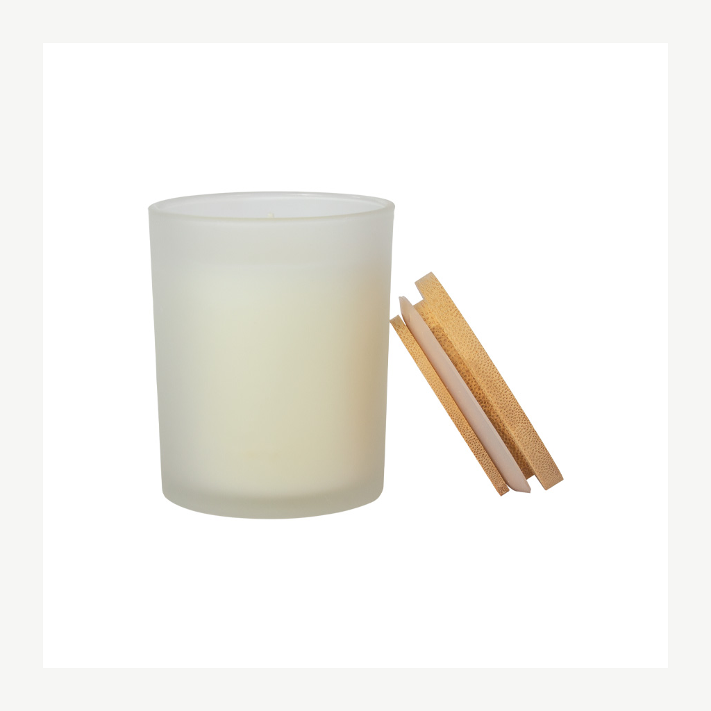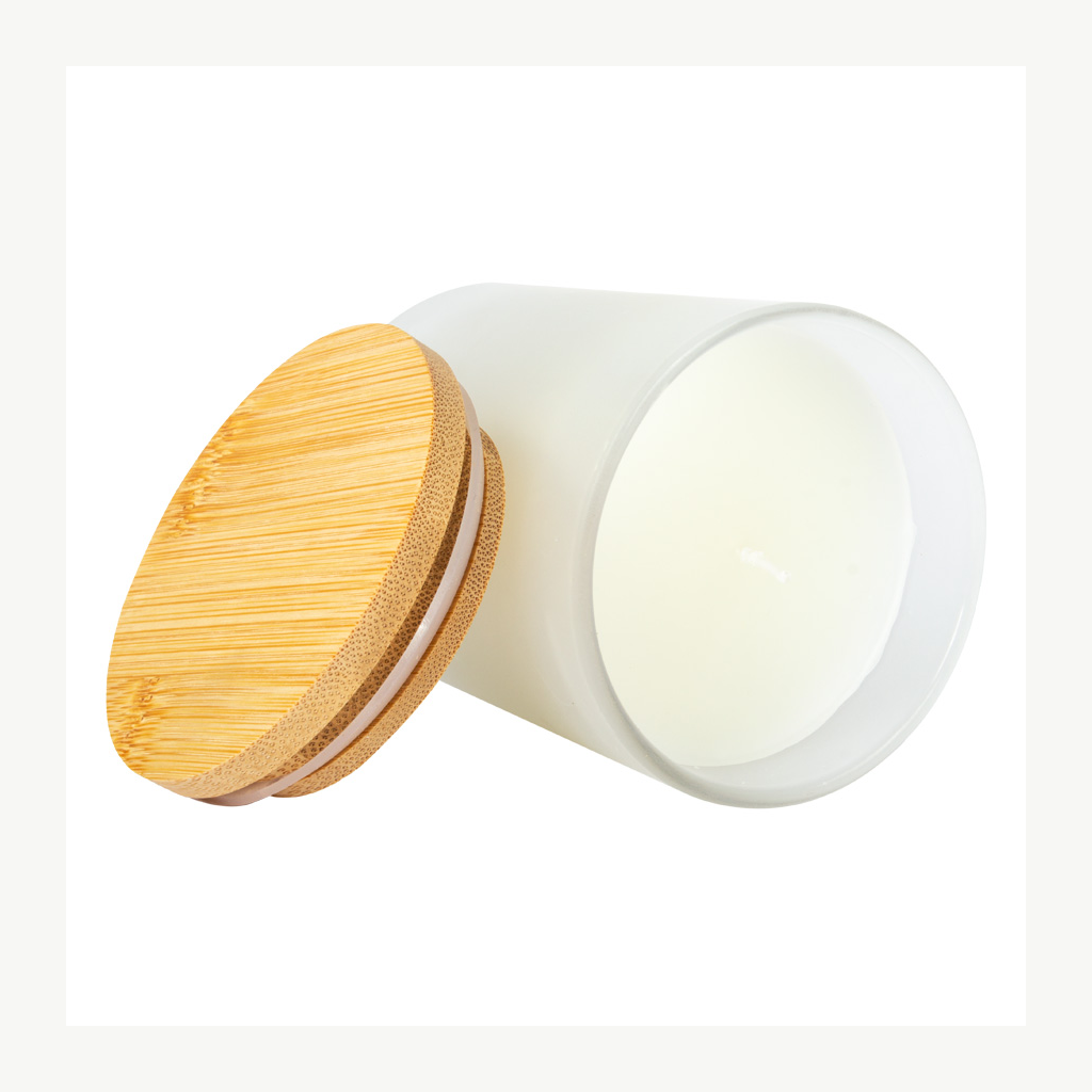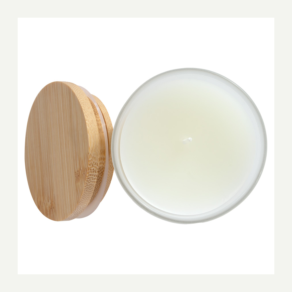 Vela aromática de 8oz en envase redondo de vidrio empavonado con tapa de Bamboo. Aroma a Vainilla. Ideal para regalo de hogar y aromaterapia. Amplia superficie de impresión de logo.