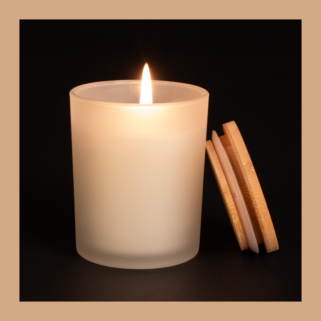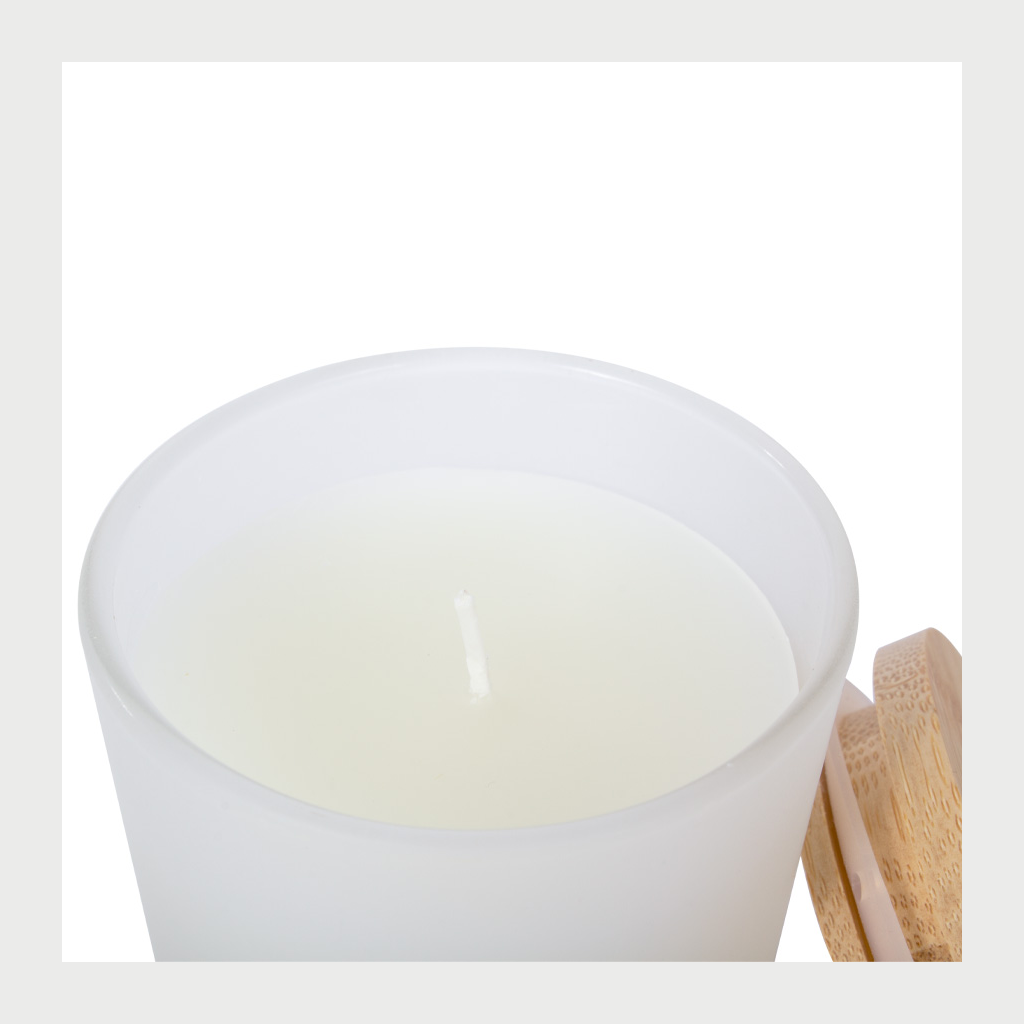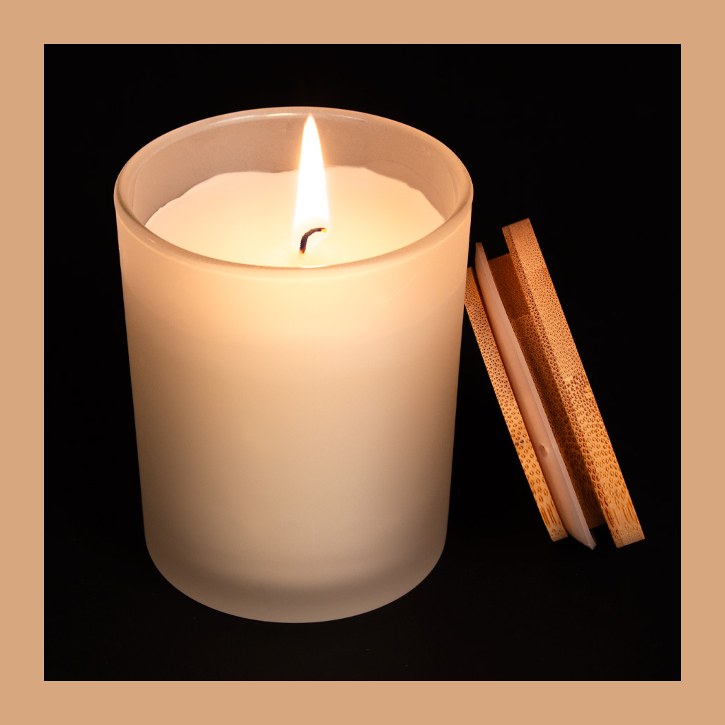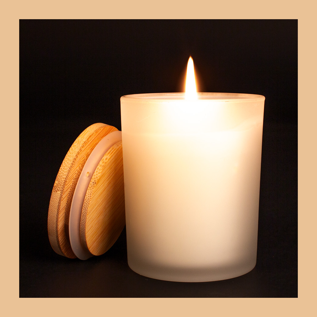 Vela aromática de 8oz en envase redondo de vidrio empavonado con tapa de Bamboo. Aroma a Vainilla. Ideal para regalo de hogar y aromaterapia. Amplia superficie de impresión de logo.